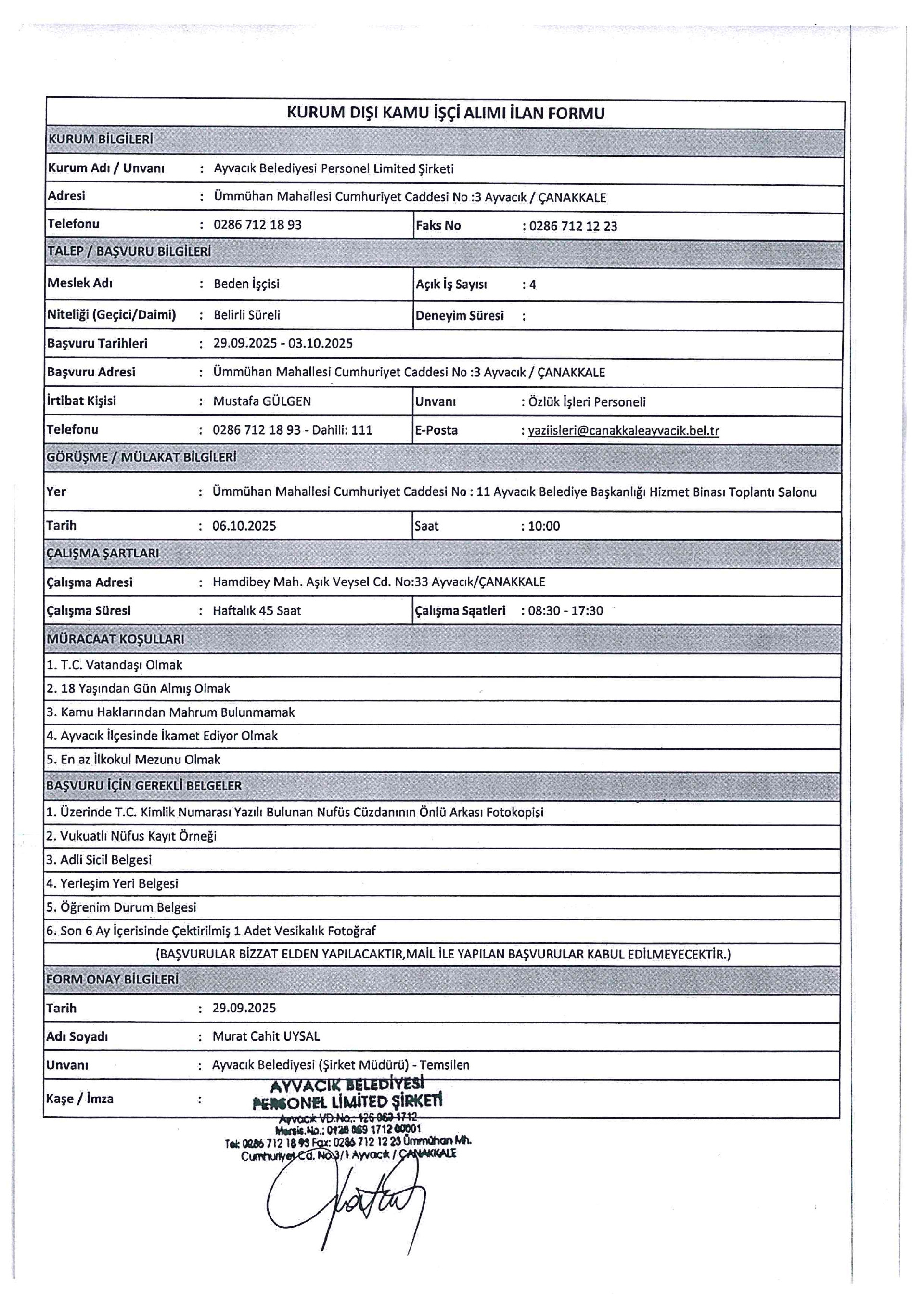 Ayvacık Belediyesi 4 İşçi Alacak. Son başvuru tarihi 3 Ekim 2025