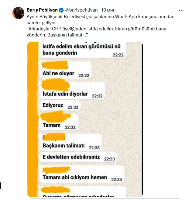 Aydın Büyükşehir Belediyesi çalışanlarının WhatsApp konuşmalarından kareler geliyor… “Arkadaşlar CHP üyeliğinden istifa edelim. Ekran görüntüsünü bana gönderin. Başkanın talimatı…”