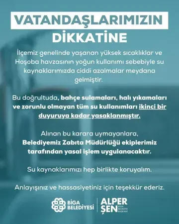 Biga Belediyesi, ilçede etkili olan aşırı sıcaklıklar ve su kaynaklarının yoğun kullanımı nedeniyle 24 Temmuz 2025 tarihinde vatandaşlara bir uyarı yayınladı. Bahçe sulama, halı yıkama ve zorunlu olmayan tüm su tüketimi, ikinci bir duyuruya kadar yasaklandı.