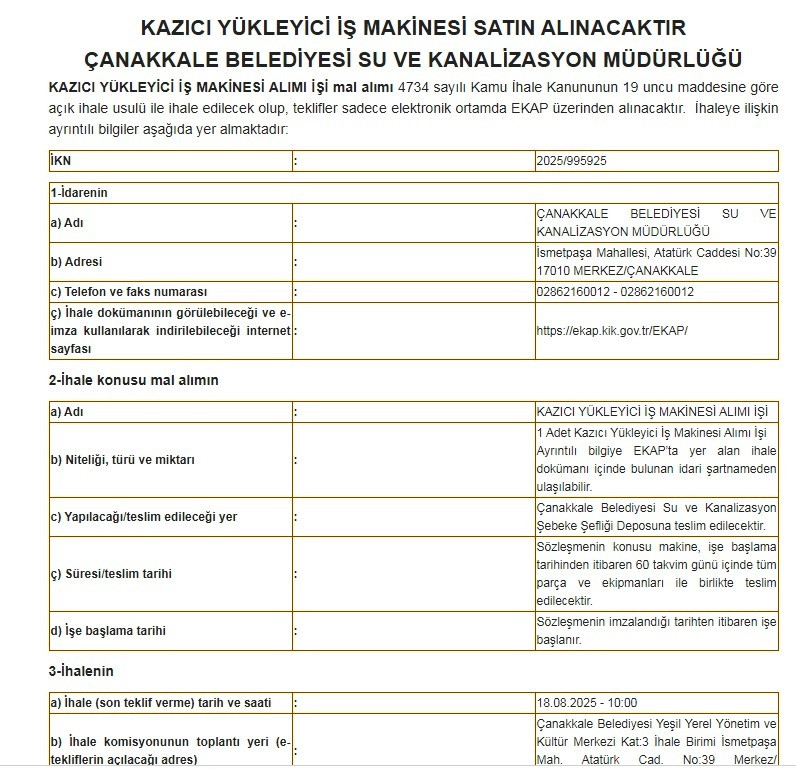 KAZICI YÜKLEYİCİ İŞ MAKİNESİ ALIMI İŞİ mal alımı 4734 sayılı Kamu İhale Kanununun 19 uncu maddesine göre açık ihale usulü ile ihale edilecek olup, teklifler sadece elektronik ortamda EKAP üzerinden alınacaktır.