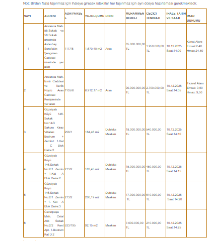 Not: Birden fazla taşınmaz için ihaleye girecek istekliler her taşınmaz için ayrı dosya hazırlaması gerekmektedir.