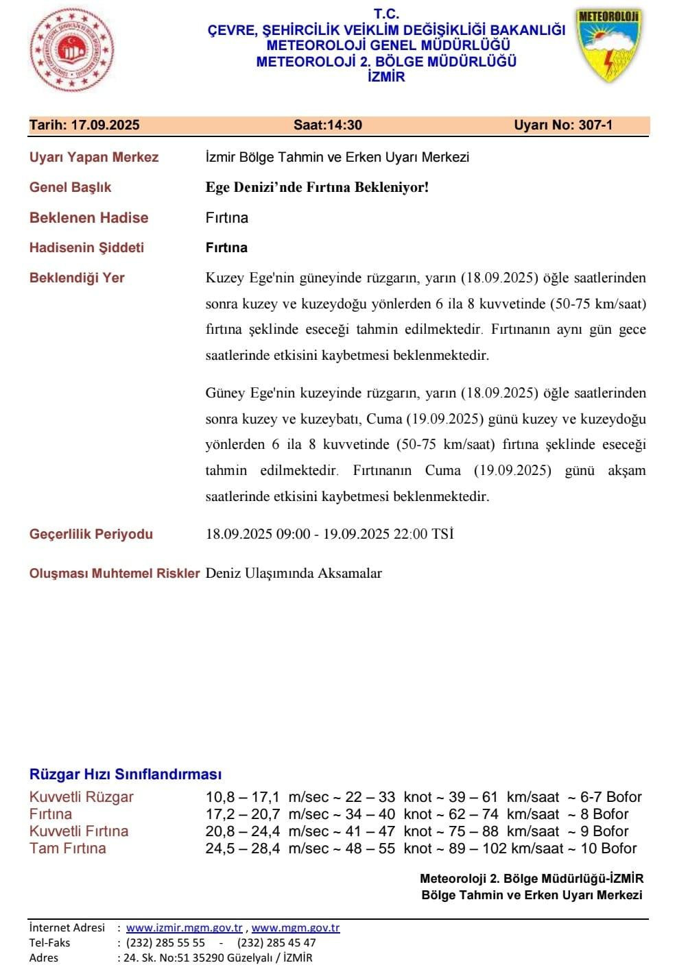 Güney Ege’nin kuzeyinde ise rüzgârın 18 Eylül 2025 öğle saatlerinden sonra kuzey ve kuzeybatı, 19 Eylül 2025 Cuma günü ise kuzey ve kuzeydoğu yönlerden 6-8 kuvvetinde (50–75 km/sa) fırtına şeklinde eseceği, Cuma akşam saatlerinde etkisini yitireceği öngörülmektedir.
