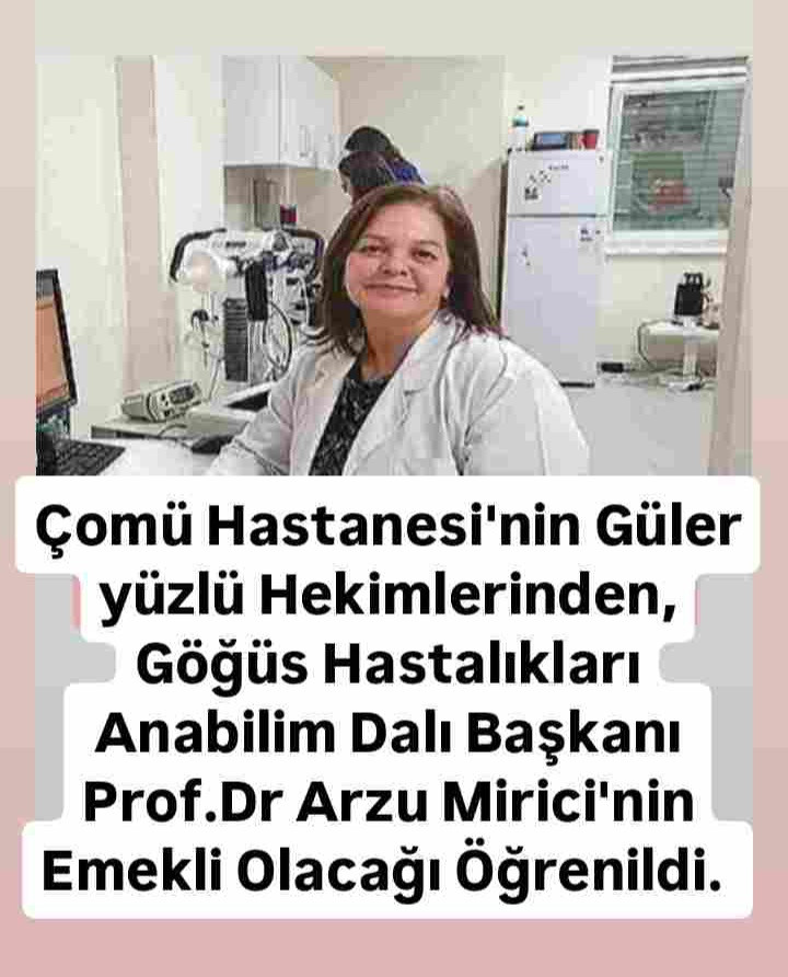 Çomü Hastanesi Göğüs Hastalıkları Anabilim dalı Başkanı Prof.Dr Arzu Mirici'nin emekli olacağı öğrenildi. Gerek meslektaşları arasında gerekse de hastaları tarafından sevilen güleryüzlü, anlayışlı, entelektüel bir hocanın emeklilik dilekçesi vermesinin şaşkınlık yarattığı öğrenildi.