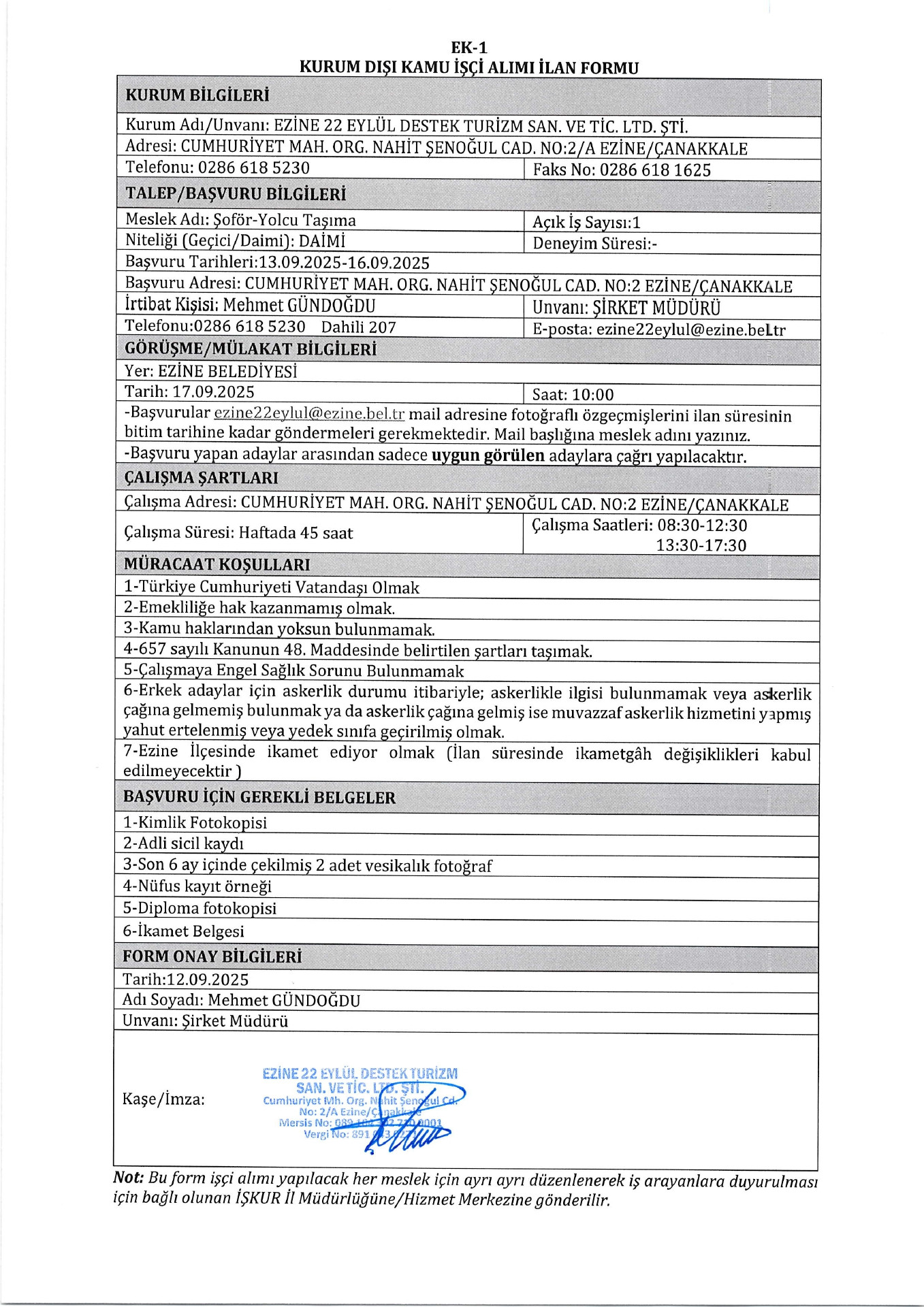 Ezine 22 Eylül Destek Turizm 1 İşçi Alacak. Son başvuru tarihi 16 eylül 2025