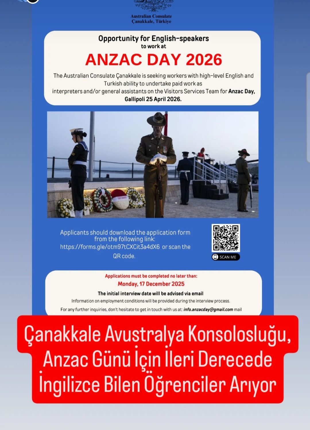 Çanakkale'deki Avustralya Konsolosluğu, her yıl büyük bir organizasyonla Gelibolu Yarımadası'nda düzenlenen Anzak Günü (Anzac Day) anma törenleri için personel alımı yapacağını duyurdu.