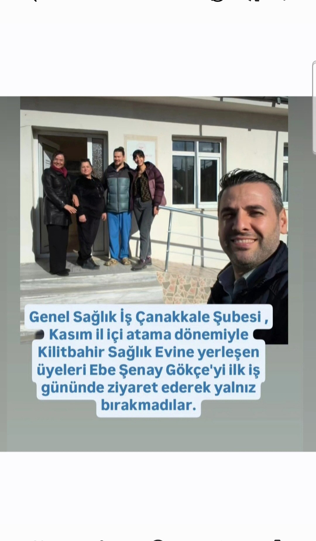 Çanakkale Genel Sağlık İş Sendikası, Kasım il içi atama dönemiyle Kilitbahir Sağlık Evine yerleşen üyeleri Şenay Gökçe'yi ilk iş gününde ziyaret ederek yalnız bırakmadılar.