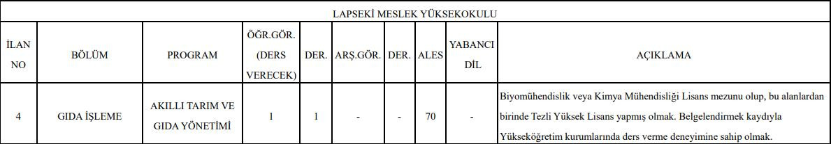 Çanakkale Onsekiz Mart Üniversitesi tarafından 21 Kasım 2025 tarihli Resmi Gazete'de ilan edilen; Lapseki Meslek Yüksekokulu Gıda İşleme Bölümü Akıllı Tarım ve Gıda Yönetimi Programı Öğretim Görevlisi kadrosunda; "Biyomühendislik veya Kimya Mühendisliği Lisans mezunu olup, bu alanlardan birinde Tezli Yüksek Lisans yapmış olmak. Belgelendirmek kaydıyla yükseköğretim kurumlarında ders verme deneyimine sahip olmak." şartı aranmıştır.