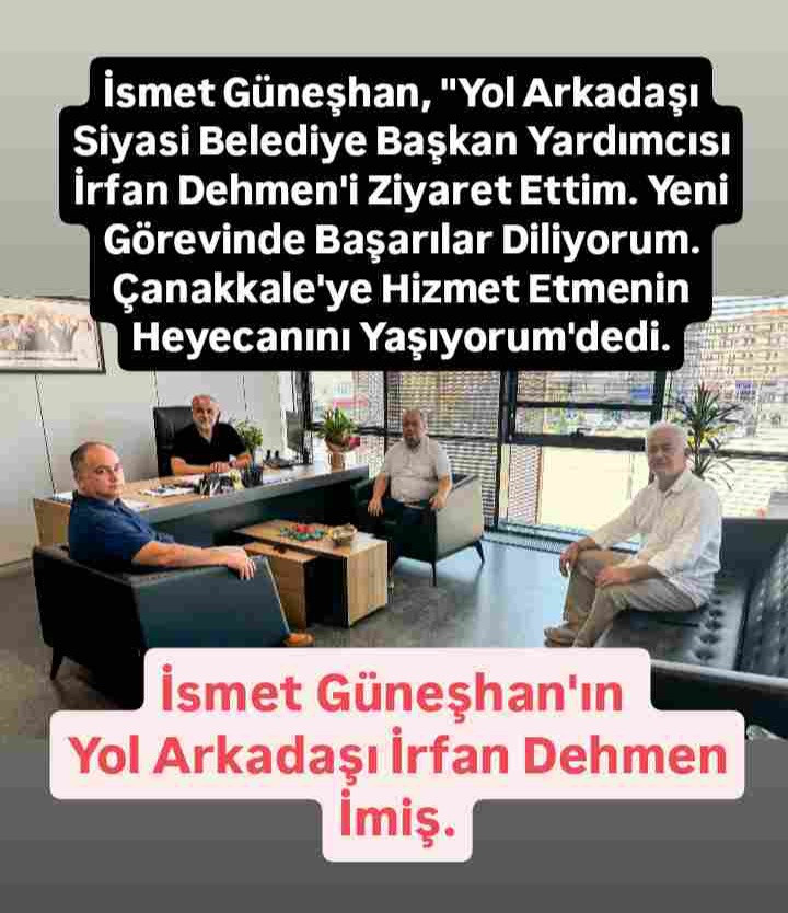 Güneşhan,' Çanakkale Belediye Başkan Yardımcılığı görevine yeni başlayan değerli yol arkadaşım İrfan Dehmen’i, İl Başkanımız Levent Gürbüz ve Merkez İlçe Başkanımız Can Ergun ile birlikte ziyaret ettik. Nazik ev sahipliği ve samimi karşılaması için kendisine teşekkür ediyor, yeni görevinde başarılar diliyorum. Çanakkale’mize birlikte hizmet etmenin heyecanını paylaşıyoruz.dedi.