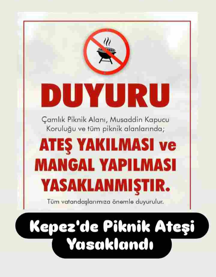 Kepez Belde sınırları içinde açık alanda ateş yakmak Yasaklandı. Musaddin Kapucu Koruluğu,Çamlık Piknik alanı ve bütün Piknik alanlarında ateş yakmak Yasaklandı.