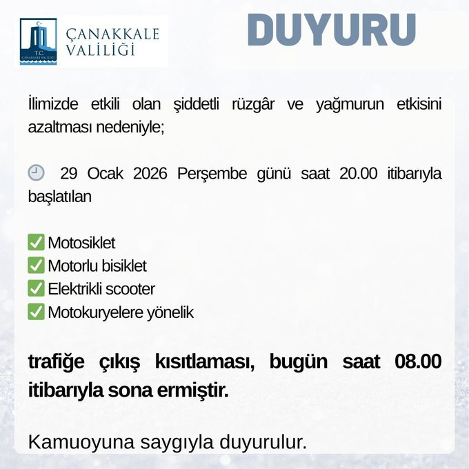 Çanakkale Valiliği, şiddetli rüzgâr ve yağmurun etkisini azaltması nedeniyle; dün akşam saat 20.00 itibarıyla başlatılan yasağın bu sabah 08.00 itibariyle kaldırıldığını duyurdu.