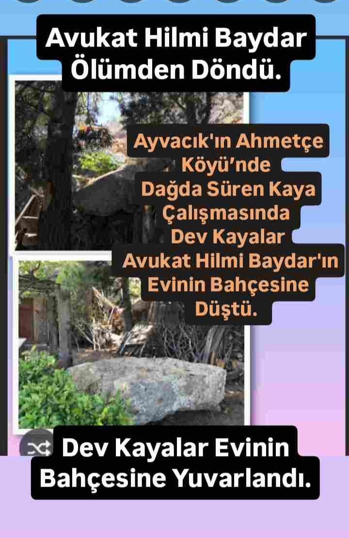 Avukat Hilmi Baydar evinin bahçesine düşen dev kayanın evde olmadığı sırada düştüğünü söyledi. Kurtulmasının mucize olduğunu söyledi.