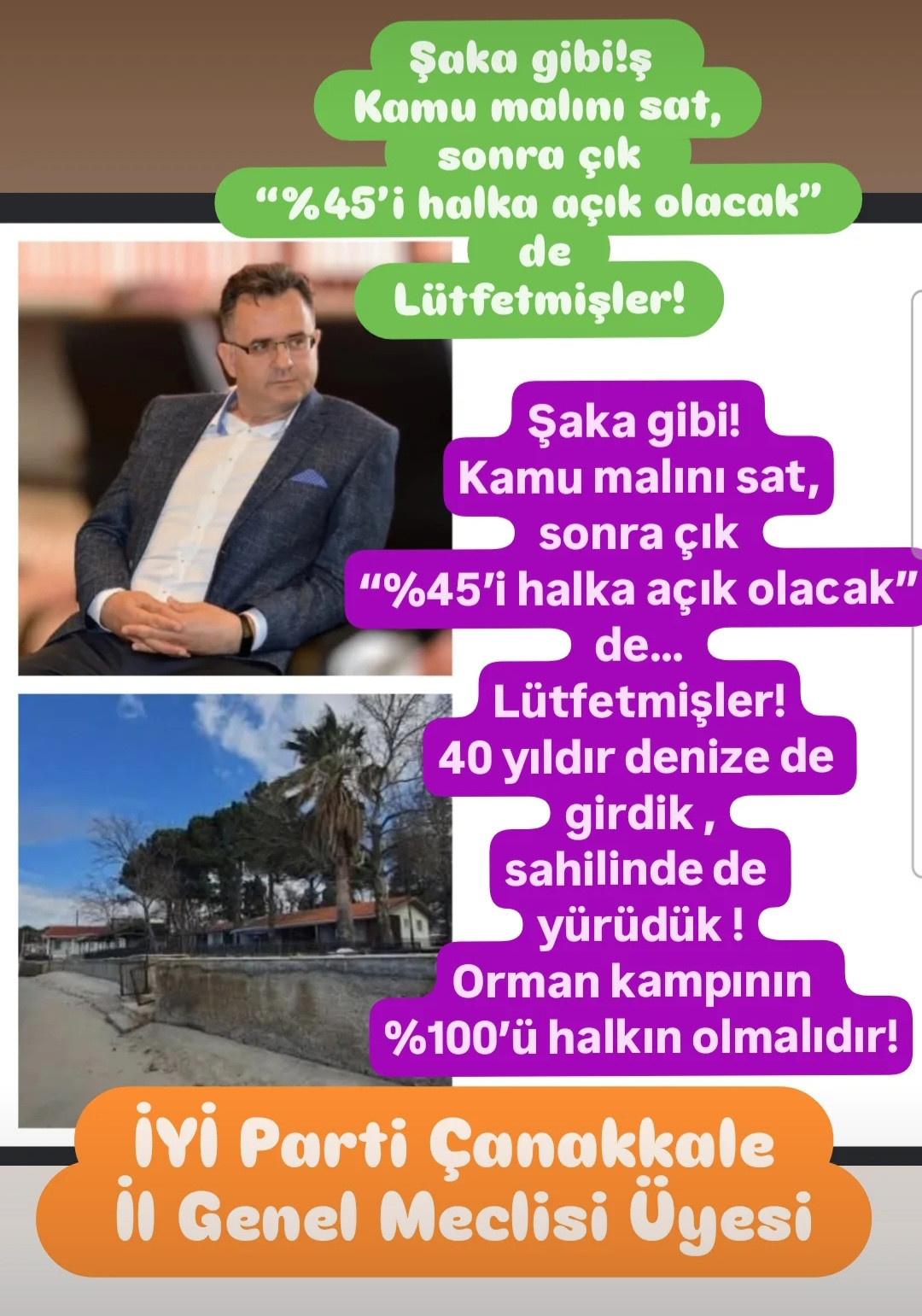 İYİ Parti İl Genel Meclisi Üyesi Murat Çağlayan, AKP İl Başkanı Abdurrahman Kuzu'nun Orman Kampının yüzde 45'i halka açık olacak açıklamasına sert yanıt verdi.