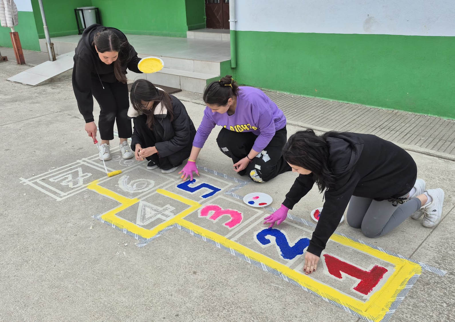 bahçesi zemine; renkli labirentler, seksek ve köşe kapmaca alanları çizen üniversiteliler, Sinekçi’deki
