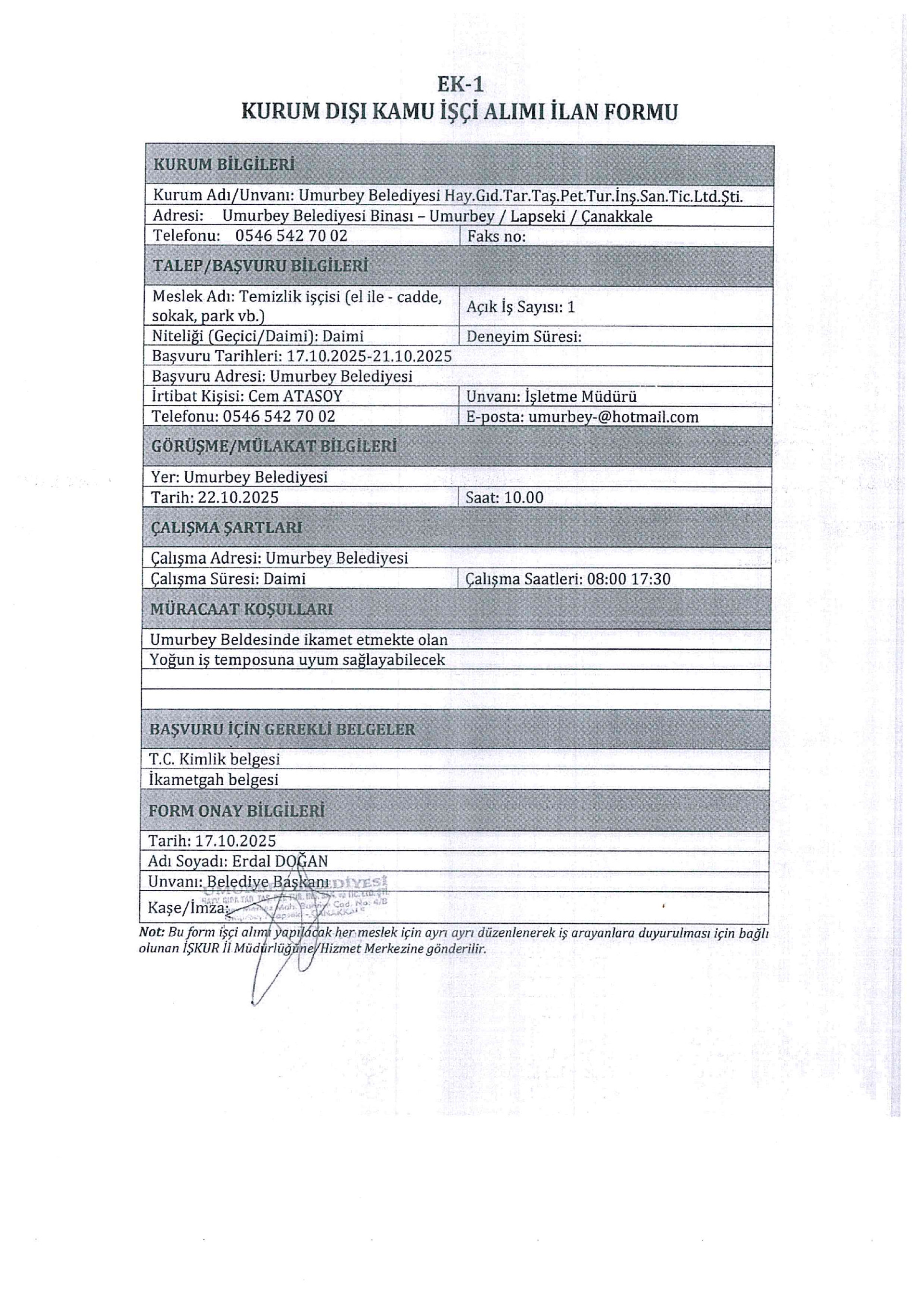 Umurbey Belediyesi 1 İşçi Alacak. Son başvuru tarihi 21 Ekim 2025