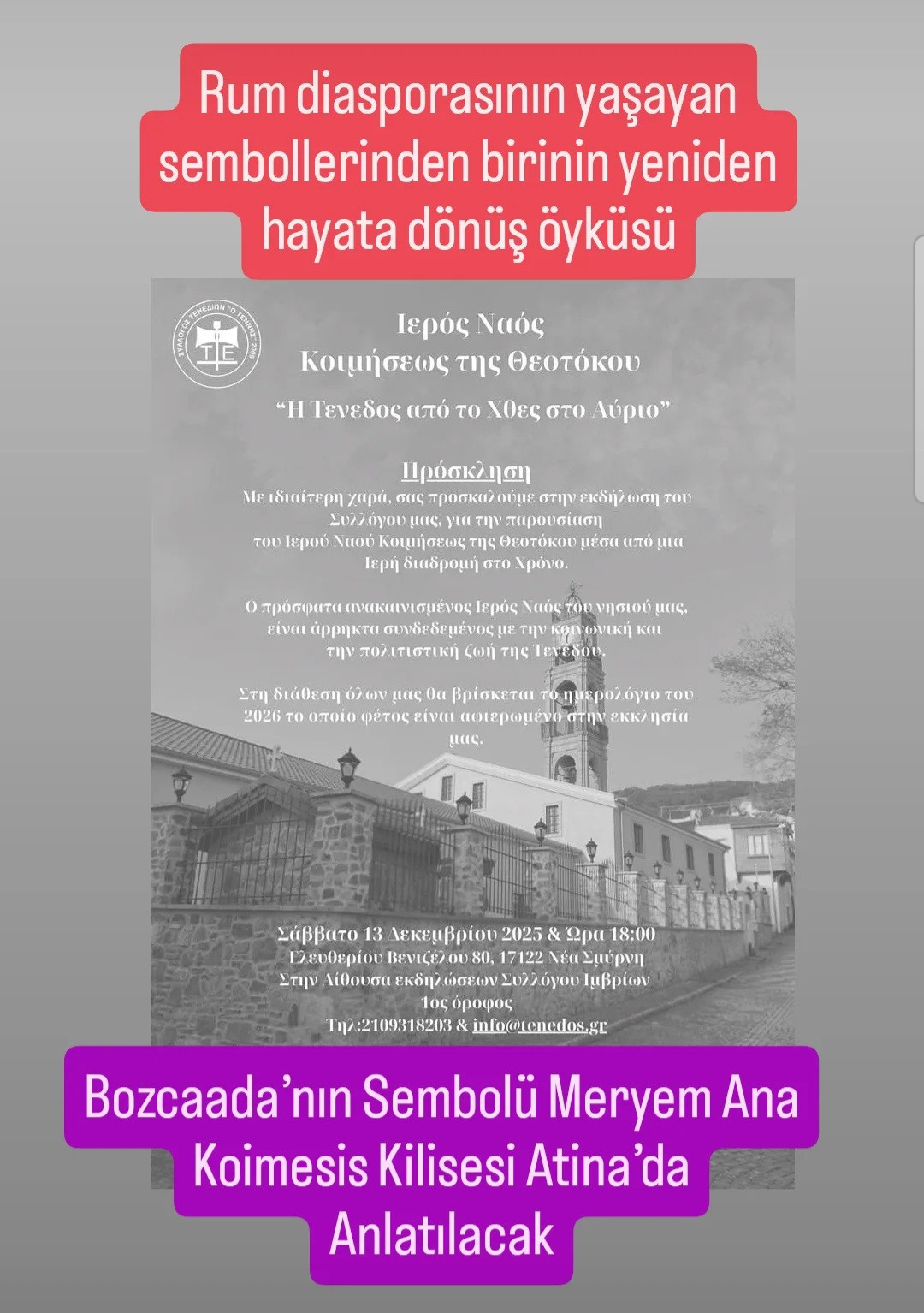 Atina’daki Tenedliler Derneği “O TENNİS”, Bozcaada’nın (Tenados) en önemli tarihi yapılarından Meryem Ana Koimesis Kilisesi’nin geçmişten bugüne uzanan hikayesini ve tamamlanan restorasyon sürecini anlatmak amacıyla özel bir etkinlik düzenliyor.