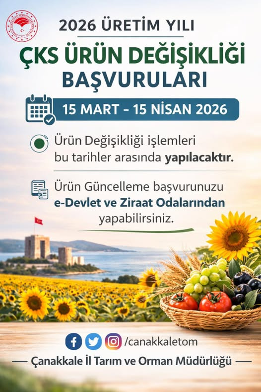 Çiftçi Kayıt Sistemi (ÇKS) kapsamında ürün değişikliği yapmak isteyen üreticilerimizin, başvurularını 15 Mart – 15 Nisan 2026 tarihleri arasında gerçekleştirmeleri gerekmektedir.