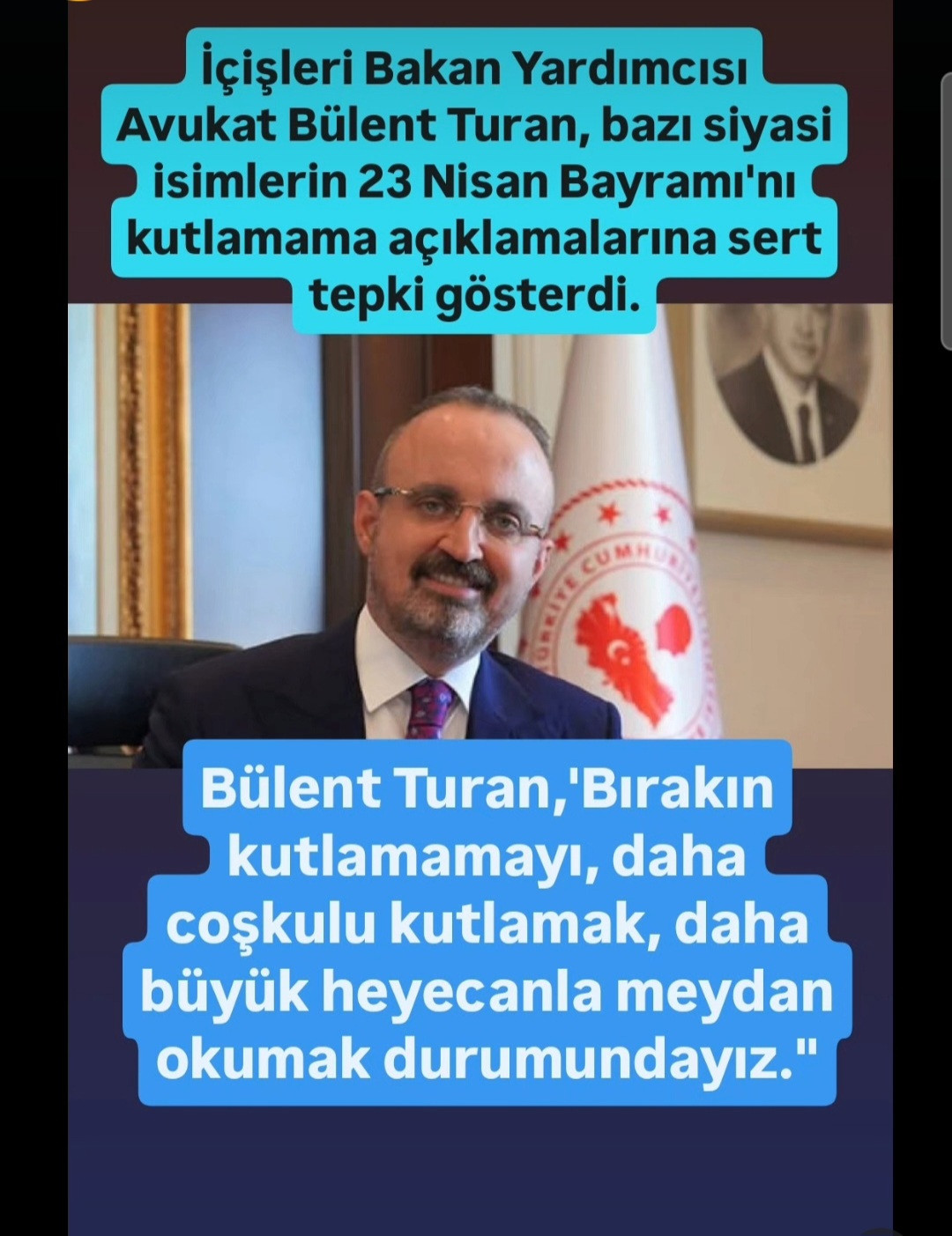 İçişleri Bakan Yardımcısı Avuat Bülent Turan, bazı siyasi isimlerin 23 Nisan Bayramı'nı kutlamama açıklamalarına sert tepki gösterdi.