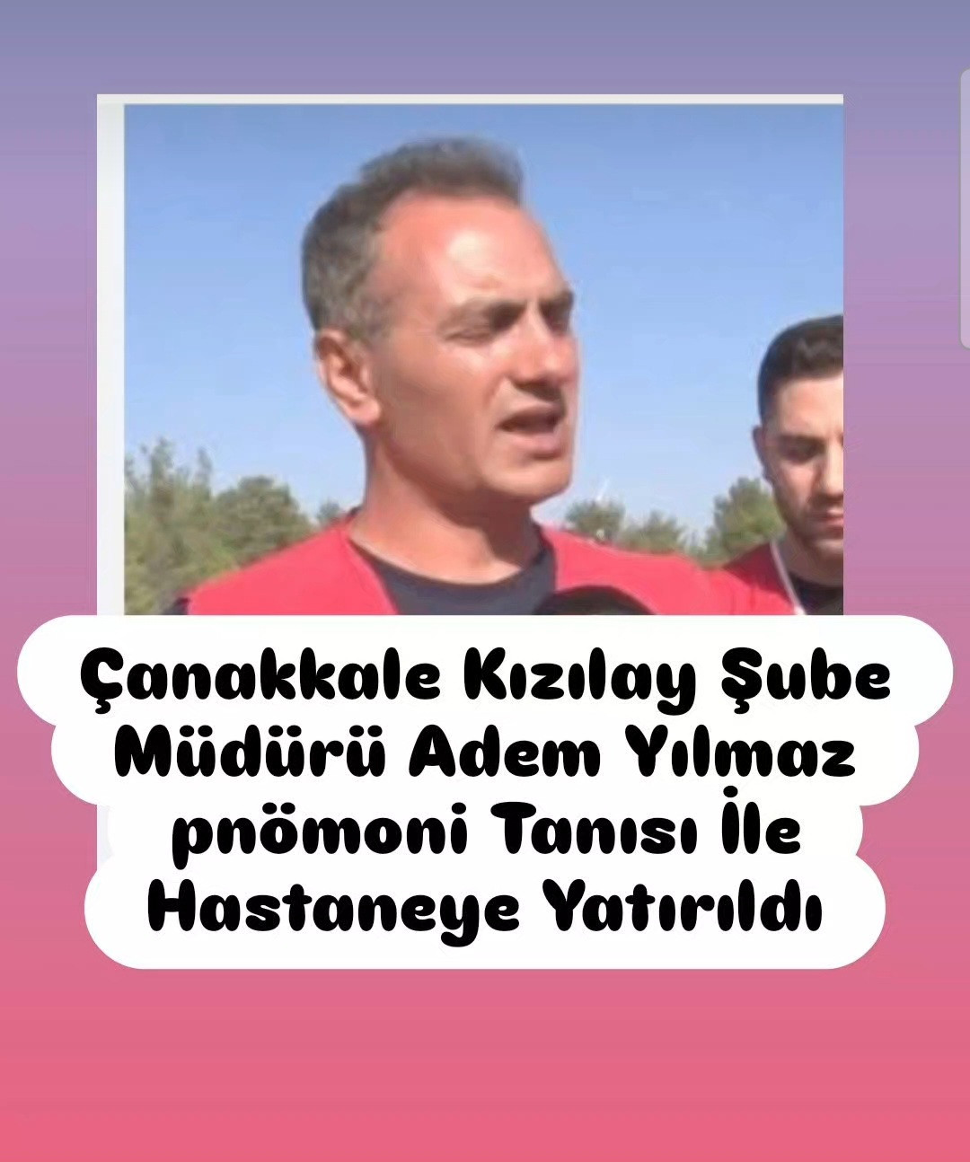 Adem Yılmaz Pnömoni Tanısı İle Hastanede. Çanakkale Kızılay Şube Müdürü Adem Yılmaz'ın Pnömoni tanısı ile Devlet Hastanesi'nde tedavi altına alındığı öğrenildi. Adem Yılmaz'a acil şifalar diliyoruz.