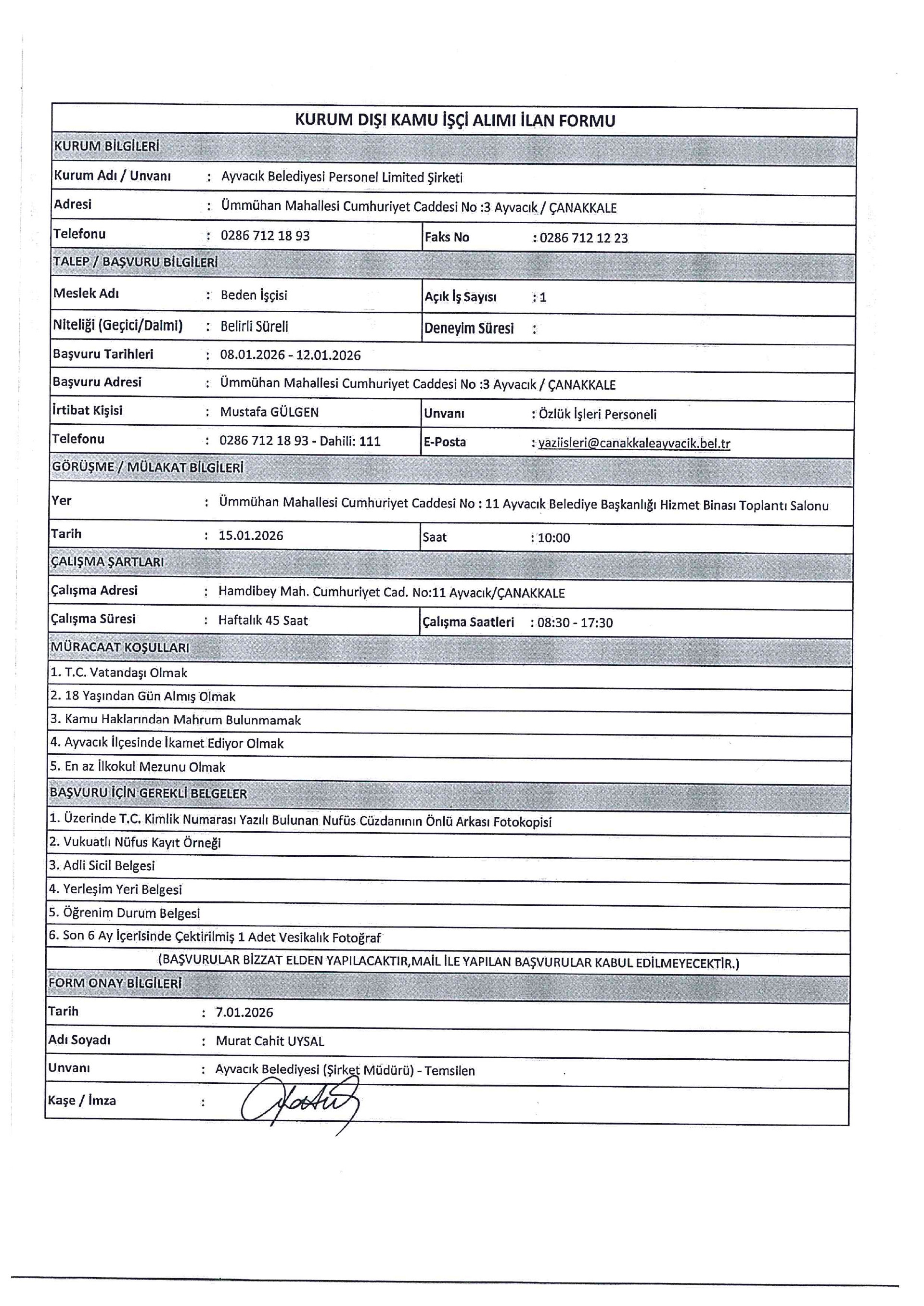 Ayvacık Belediyesi 2 İşçi Alacak. Son başvuru tarihi 12 Ocak 2026