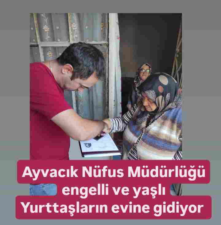 Ayvacık İlçe Nüfus Müdürlüğü personeli olarak dairemize gelemeyen engelli ve yaşlı vatandaşlarımızın adreste nüfus hizmeti kapsamında TCKK başvurularını alarak yurtaşların Hayatının Her Anında yanınızda olduklarını belirttiler.