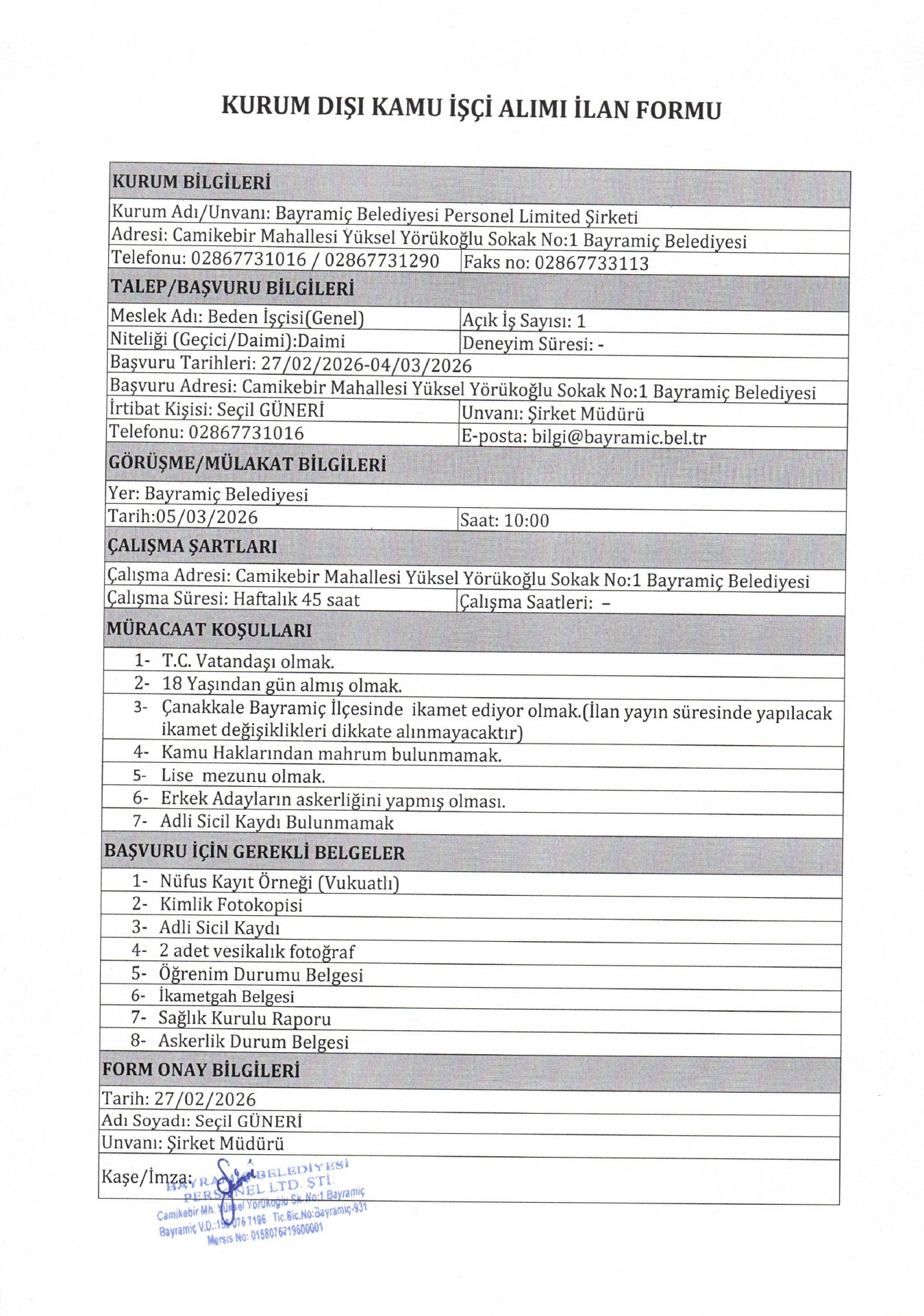 Bayramiç Belediyesi 1 İşçi Alacak. Son başvuru tarihi 4 Mart 2026