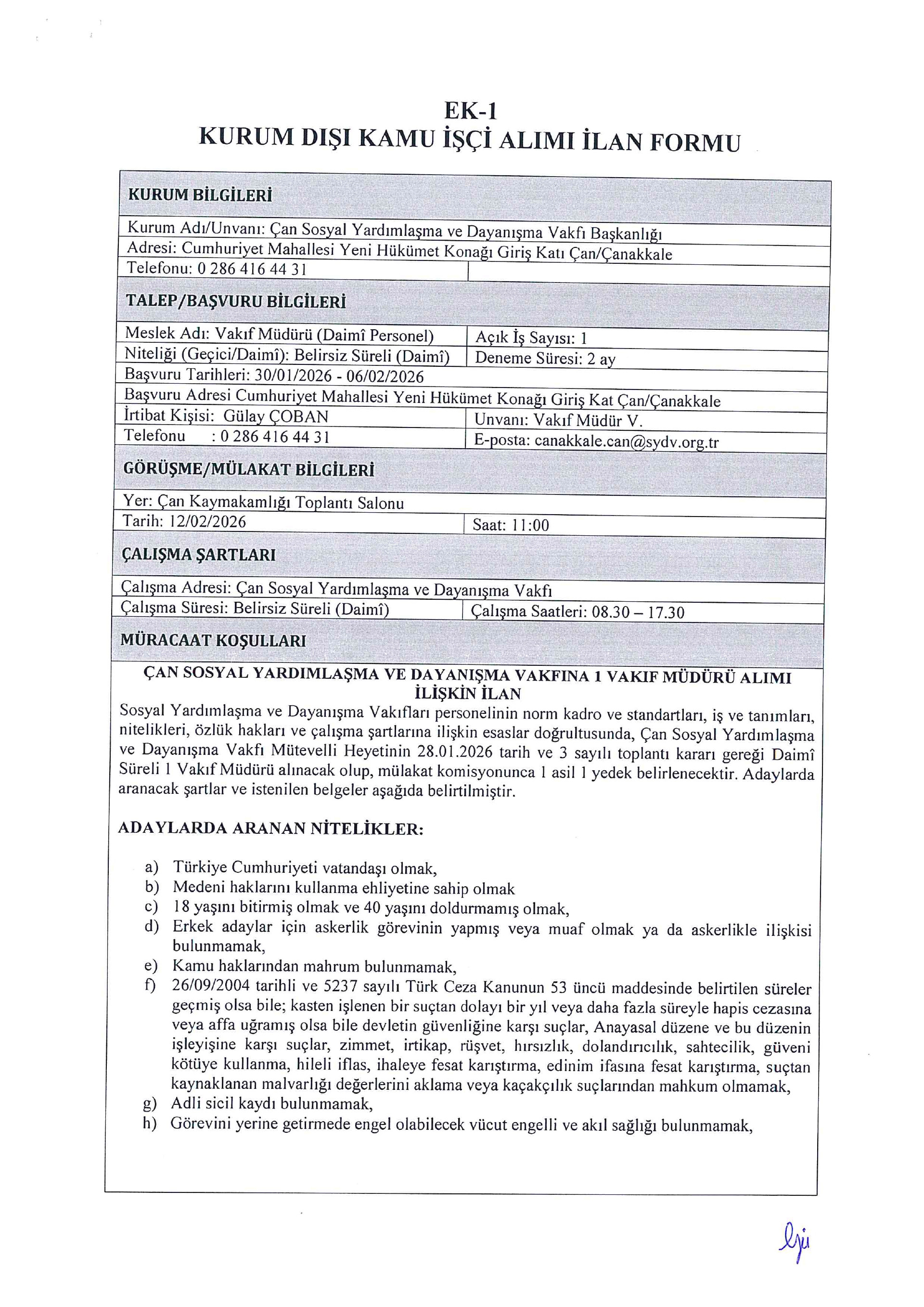 Çan SYDV Geçici 2 İşçi Alacak. Son başvuru tarihi 6 Şubat 2026