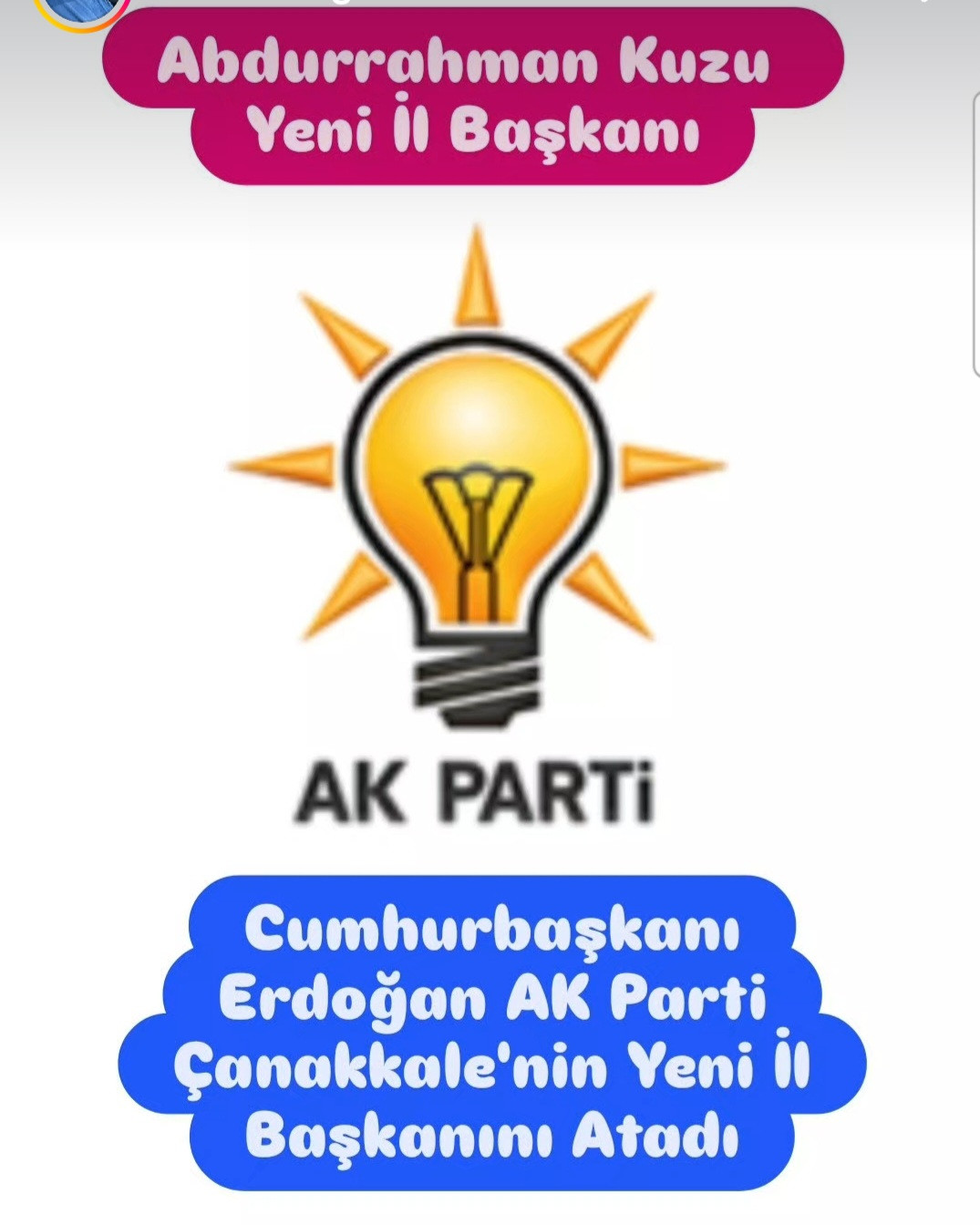 Çanakkale AK Partinin yeni il başkanını Cumhurbaşkanı Erdoğan açıkladı. Abdurrahman Kuzu yeni il başkarı olarak atandı.