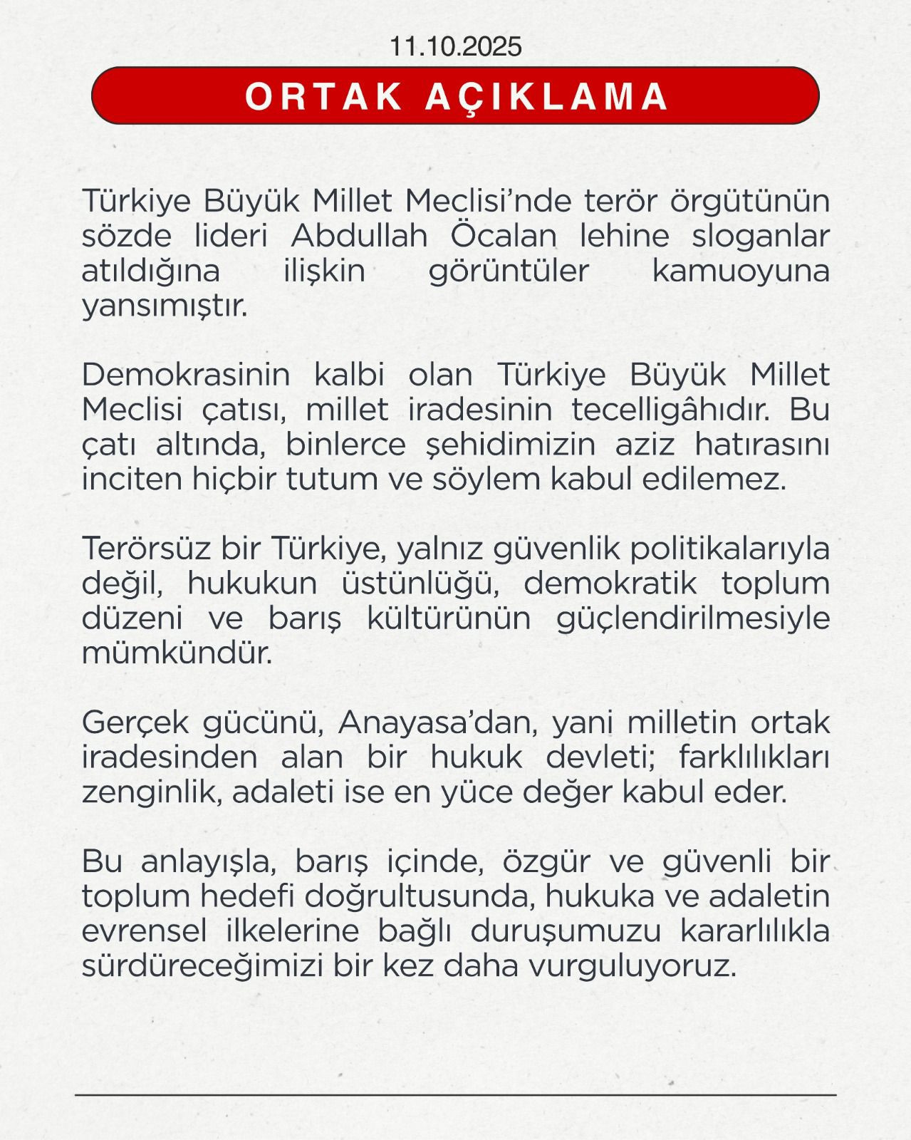 Türkiye Büyük Millet Meclisi’nde terör örgütünün sözde lideri Abdullah Öcalan lehine sloganlar atıldığına ilişkin görüntüler kamuoyuna yansımıştır. Demokrasinin kalbi olan Türkiye Büyük Millet Meclisi çatısı, millet iradesinin tecelligâhıdır. Bu çatı altında, binlerce şehidimizin aziz hatırasını inciten hiçbir tutum ve söylem kabul edilemez. Terörsüz bir Türkiye, yalnız güvenlik politikalarıyla değil, hukukun üstünlüğü, demokratik toplum düzeni ve barış kültürünün güçlendirilmesiyle mümkündür. Gerçek gücünü, Anayasa’dan, yani milletin ortak iradesinden alan bir hukuk devleti; farklılıkları zenginlik, adaleti ise en yüce değer kabul eder. Bu anlayışla, barış içinde, özgür ve güvenli bir toplum hedefi doğrultusunda, hukuka ve adaletin evrensel ilkelerine bağlı duruşumuzu kararlılıkla sürdüreceğimizi bir kez daha vurguluyoruz.