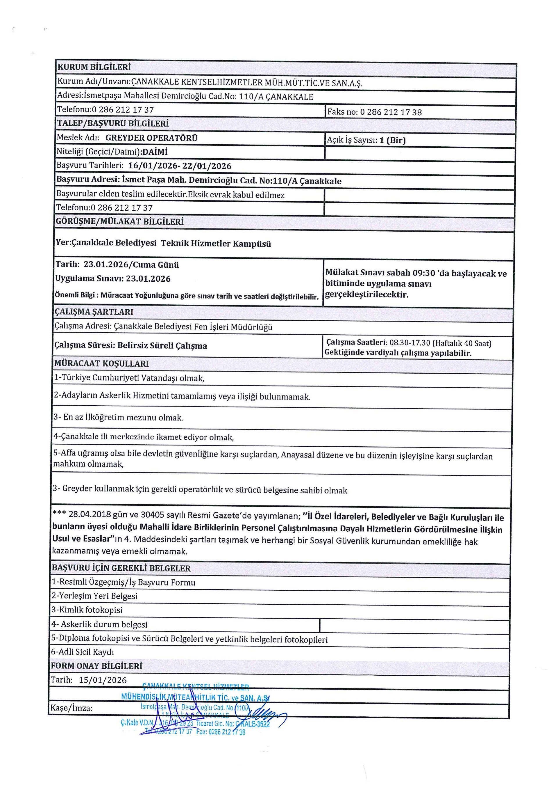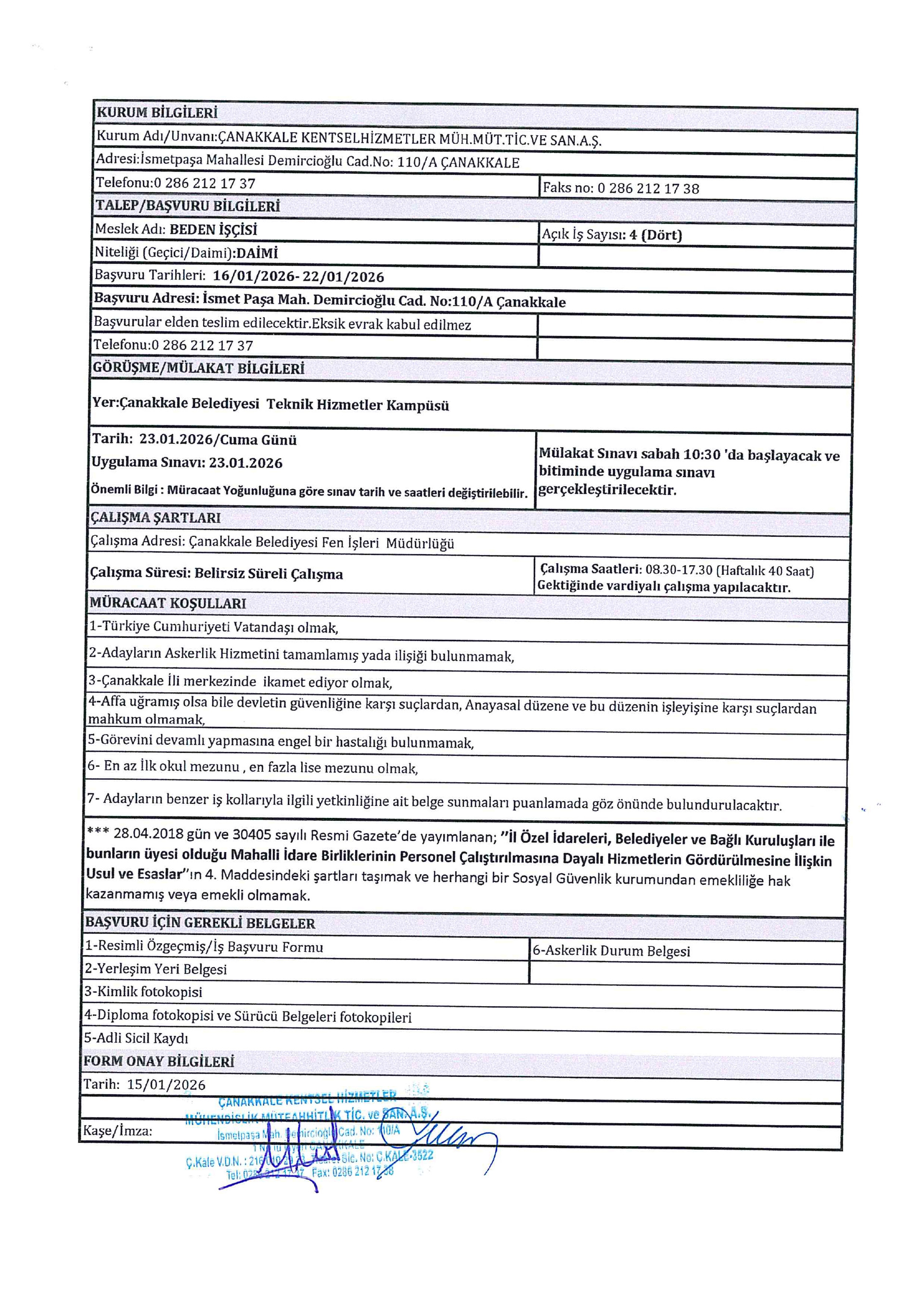 Çanakkale Kentsel Hizmetler 5 İşçi Alacak. Son başvuru tarihi 22 Ocak 2026