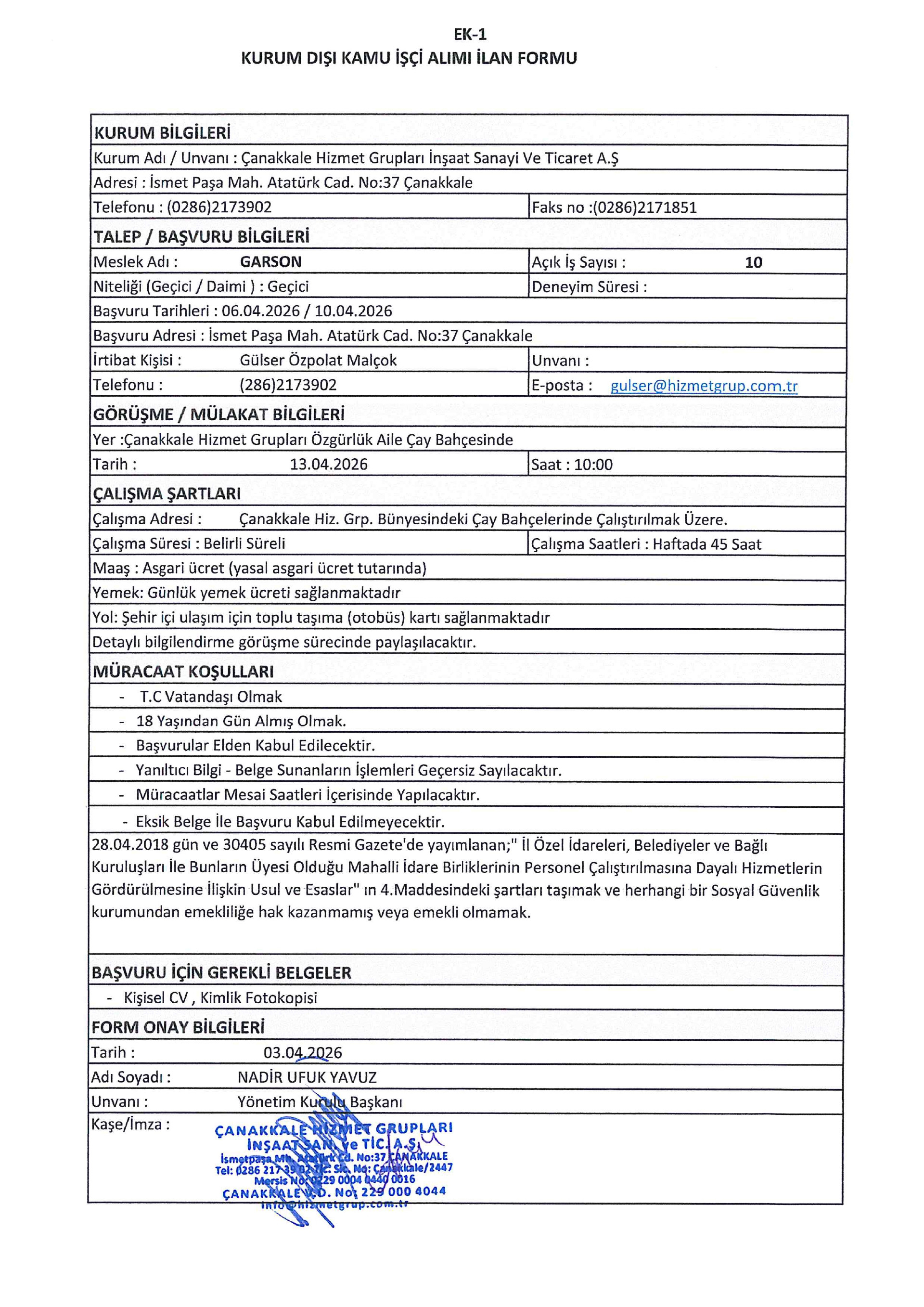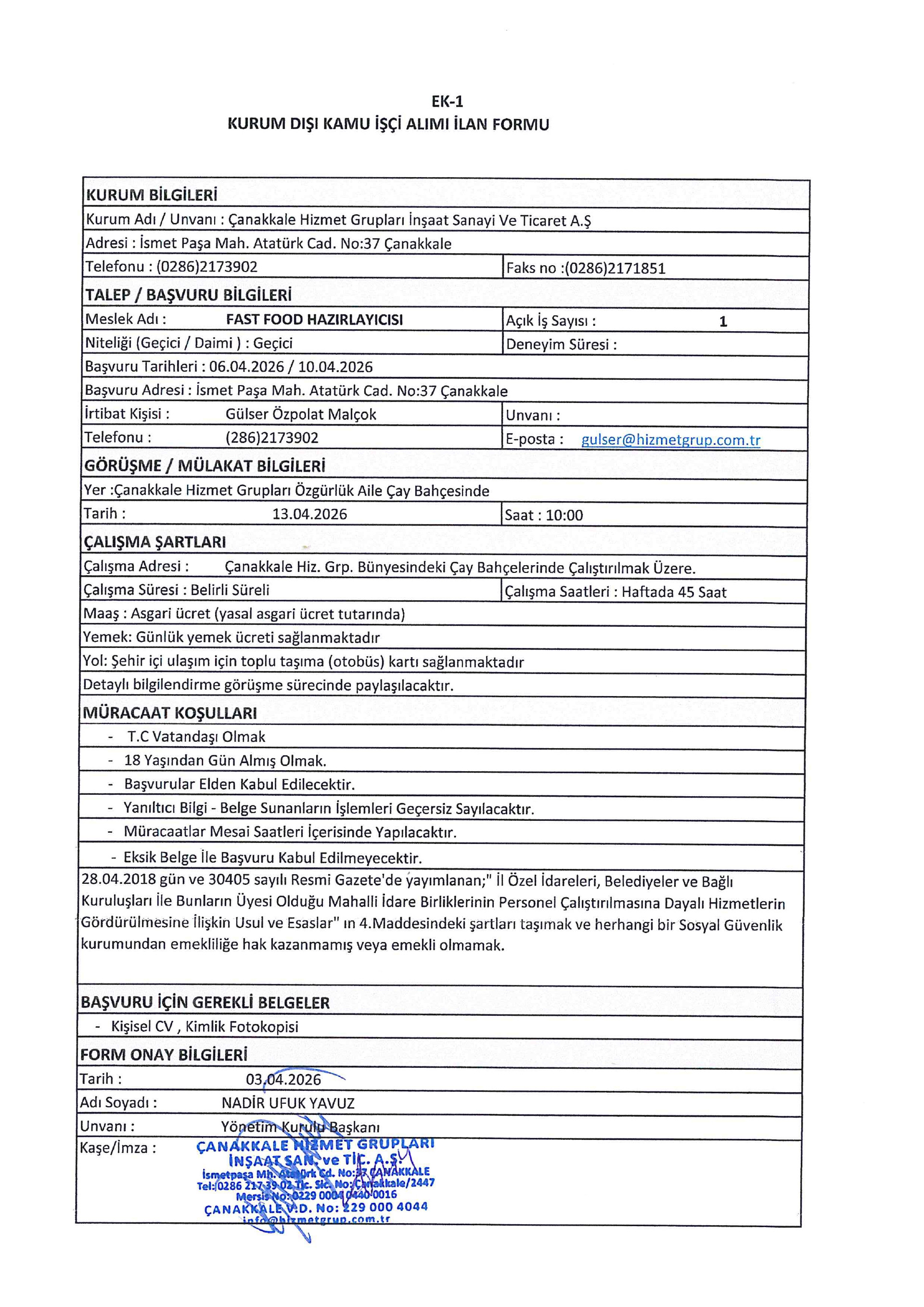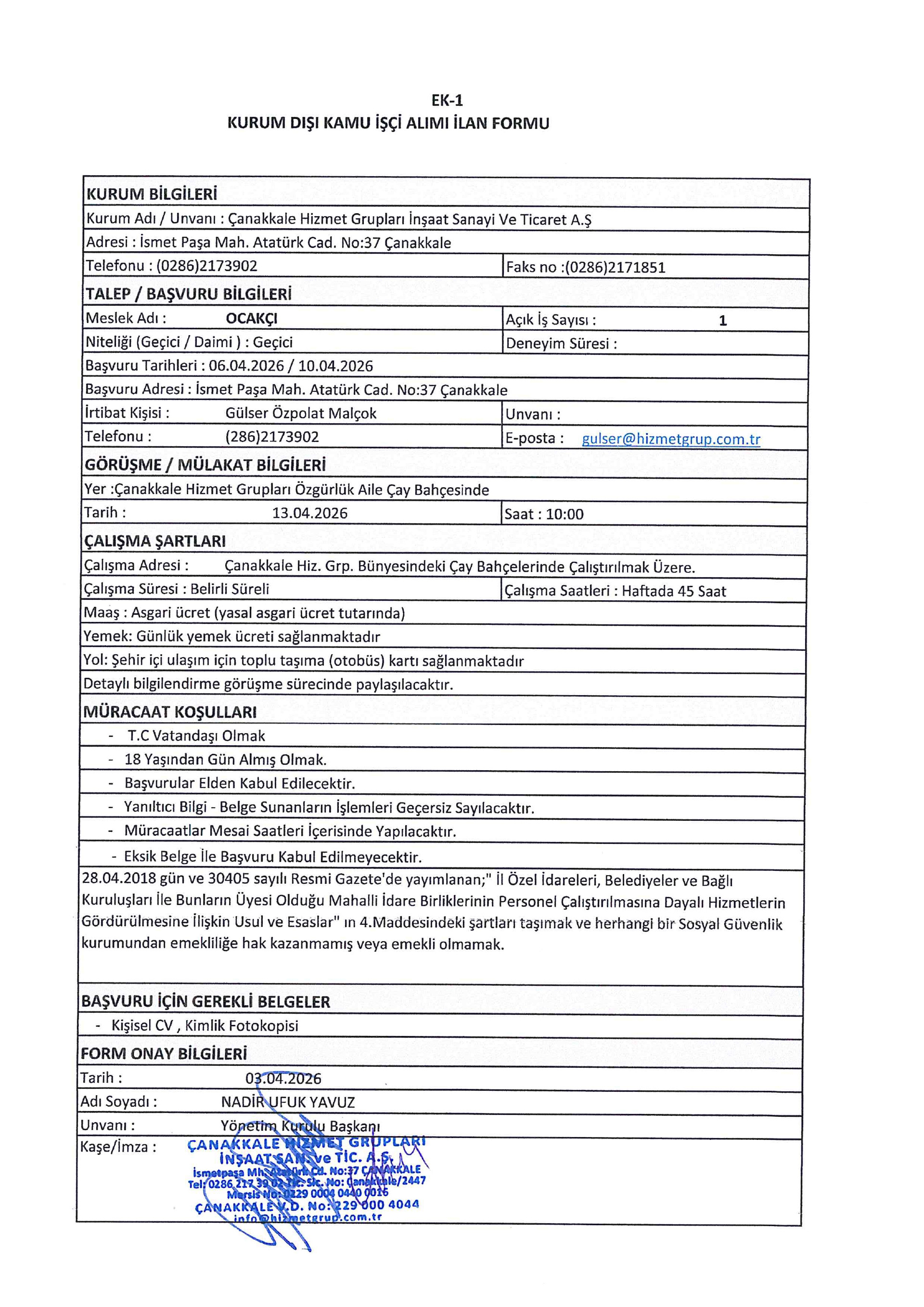 Çanakkale Hizmet Grupları Geçici 13 İşçi Alacak.