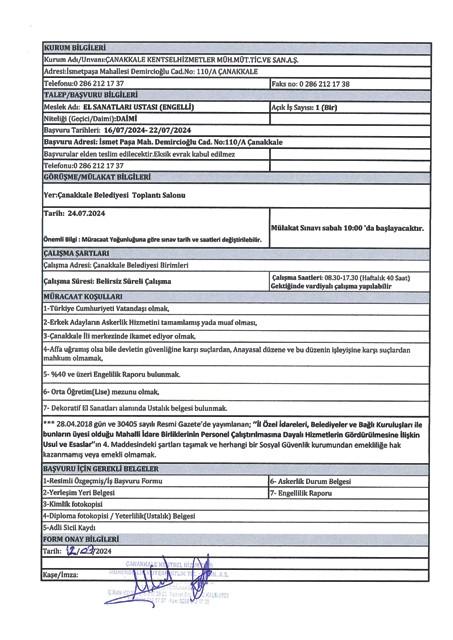 Çanakkale Kentsel Hizmetler, 3 İşçi Alacak. Son başvuru tarihi 22 temmuz 2024