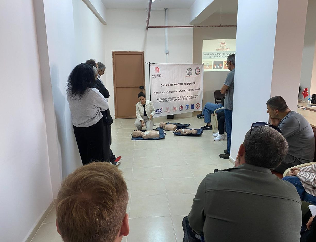 Çanakkale İl Sağlık Müdürlüğü İlkyardım Birimi tarafından Çanakkale Konyalılar Derneği “Hayata el uzat; Afet Bilinci ve Arama Kurtarma” projesi kapsamında İlkyarım eğitimi verildi. Kursiyerler tarafından teorik ve pratik olmak üzere eğitim uygulamalı olarak gerçekleştirildiği bildirildi.