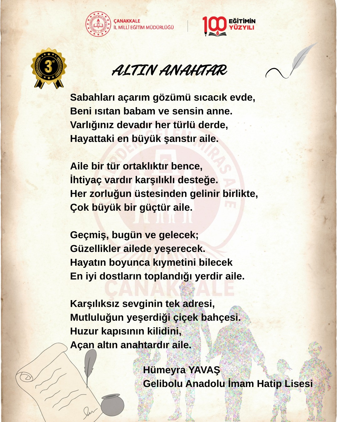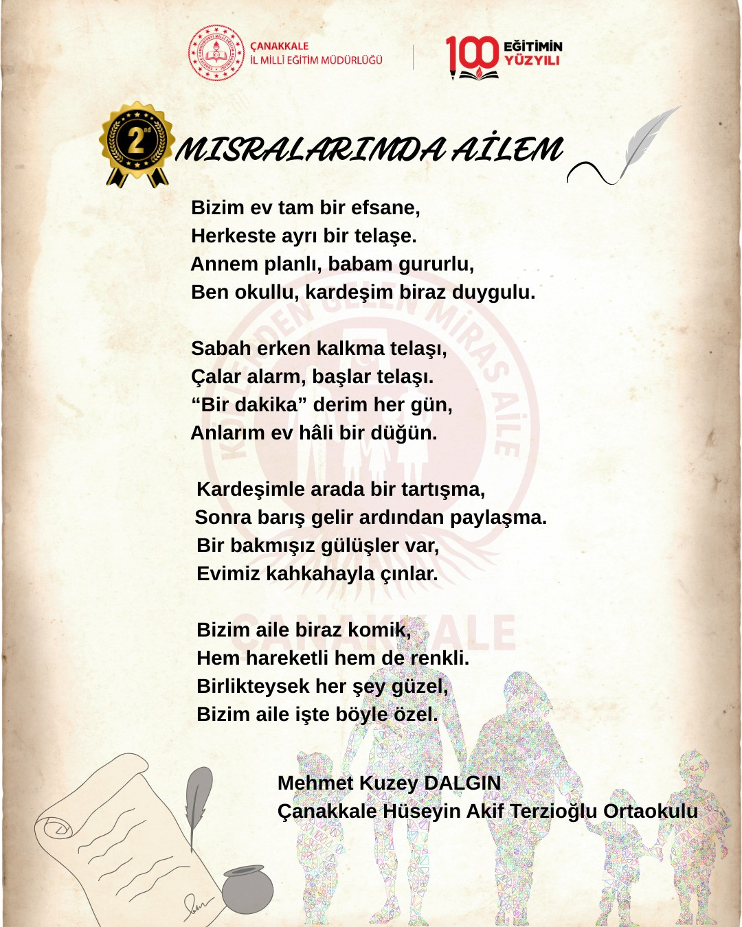 Çanakkale İl Milli Eğitim Müdürlüğü tarafından KÖKLERDEN GELEN MİRAS: AİLE Projesi kapsamında düzenlenen "Mısralarda Ailem" konulu şiir yarışmasına katılan eserler eser değerlendirme komisyonunca incelendiği açıklandı.