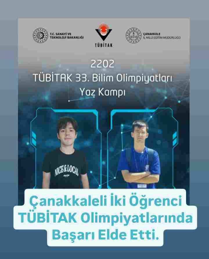 Çanakkaleli Öğrenciler TÜBİTAK Olimpiyatlarında Başarılı oldu. Biga Fen Lisesi öğrencisi İhsan Kubilay Akyel (Coğrafya) ve Çanakkale Fen Lisesi öğrencisi Semyan Güney Özoğulları (Kimya) alanında katıldıkları TÜBİTAK 33. Bilim Olimpiyatları Yaz Kampı’nı başarıyla tamamlamışladılar.