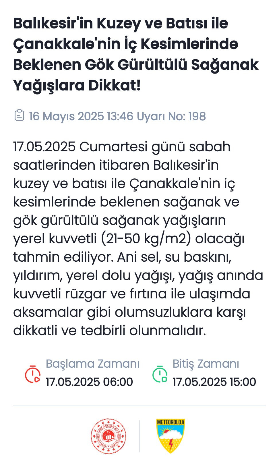 Çanakkale'ye Sağanak Yağmur Uyarısı .Meteorolojik Uyarı