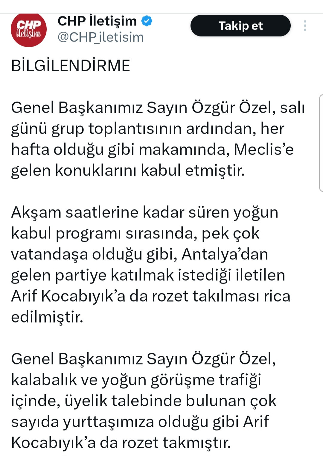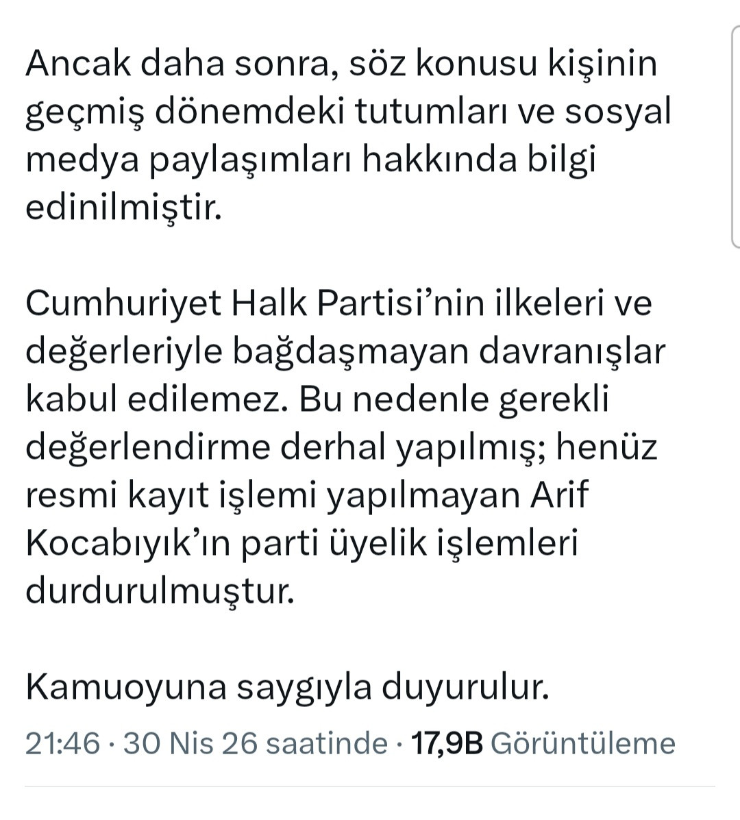 Cumhuriyet Halk Partisi’nin ilkeleri ve değerleriyle bağdaşmayan davranışlar kabul edilemez. Bu nedenle gerekli değerlendirme derhal yapılmış; henüz resmi kayıt işlemi yapılmayan Arif Kocabıyık’ın parti üyelik işlemleri durdurulmuştur.