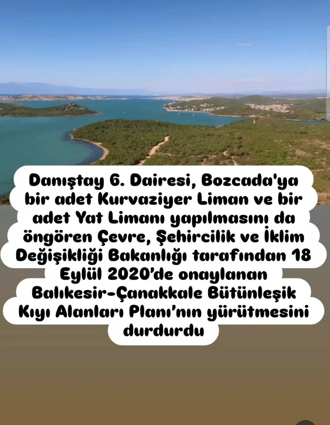 Danıştay 6. Dairesi, Bozcada'ya bir adet Kurvaziyer Liman ve bir adet Yat Limanı yapılmasını da öngören Çevre, Şehircilik ve İklim Değişikliği Bakanlığı tarafından 18 Eylül 2020’de onaylanan Balıkesir-Çanakkale Bütünleşik Kıyı Alanları Planı’nın yürütmesini durdurdu