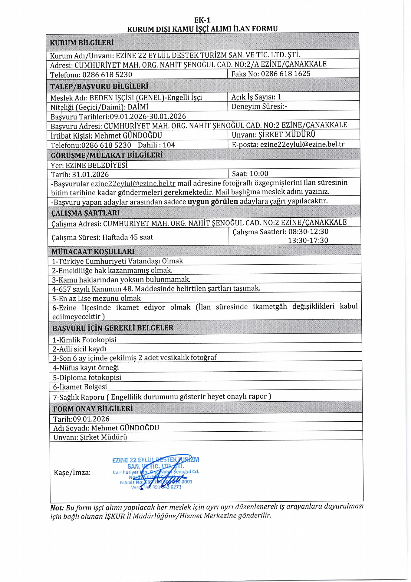 Ezine 22 Eylül Destek Turizm 1 İşçi Alacak.