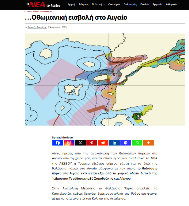 Yeni Midilli Gazetesi, haberinde , "Ülkemizin Ege'deki deniz parklarını duyurmasından birkaç gün sonra, Türkiye, bugün Ege'deki kendi deniz parkları haritasını yayınladı. Haritaya göre, Ege'deki deniz parkı, İmroz ve Bozcaada'nın batısındaki karasularının dışında, Semadirek ve Limni arasında uzanıyor. "dendi