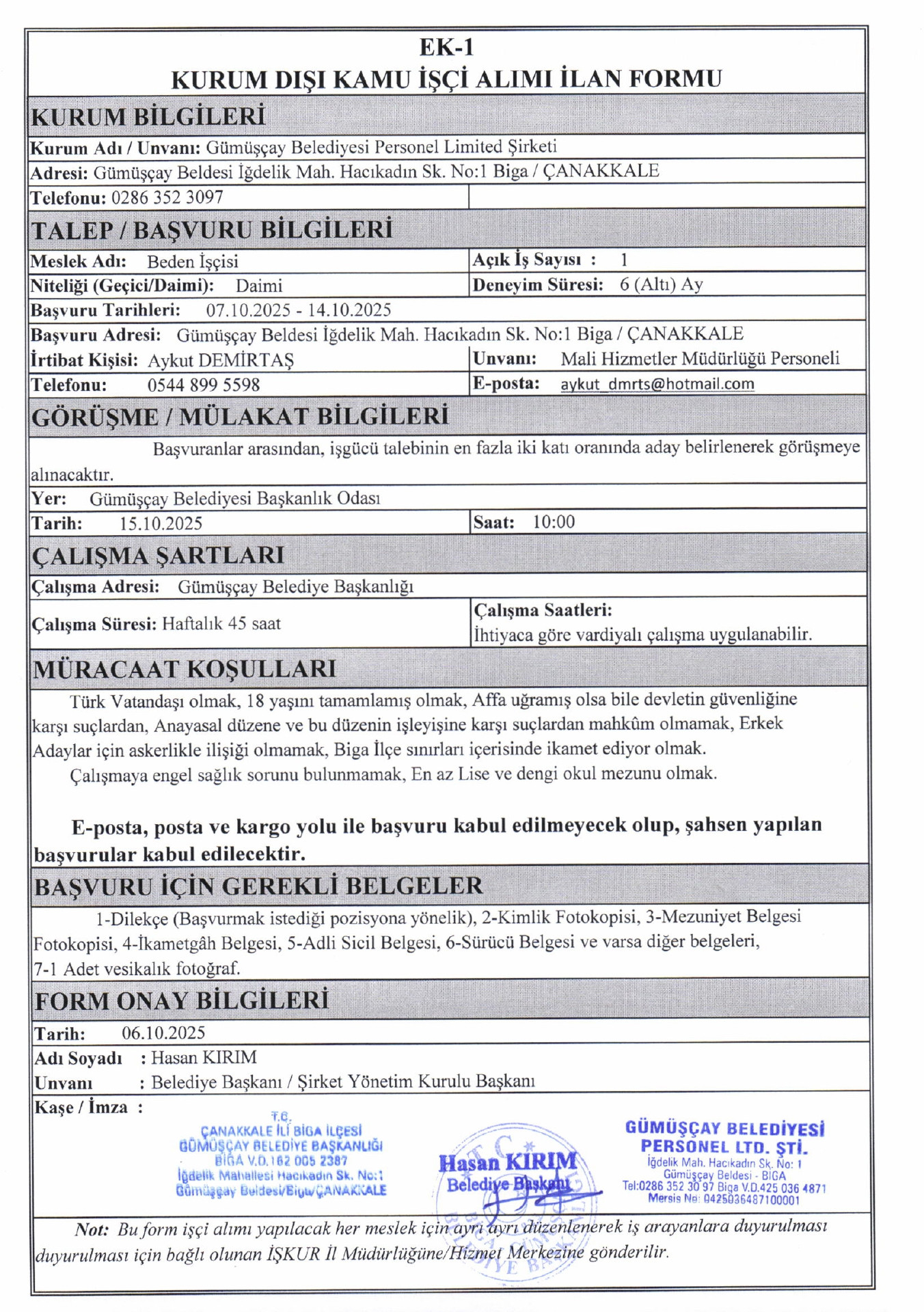 Gümüşçay Belediyesi 1 İşçi Alacak. Son başvuru tarihi 14 Ekim 2025