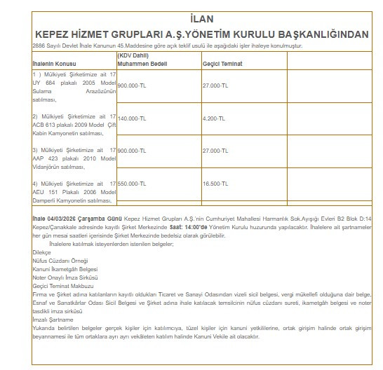 Kepez Hizmet Grupları A.Ş.'den 4 adet taşınır satışa çıkarıldı