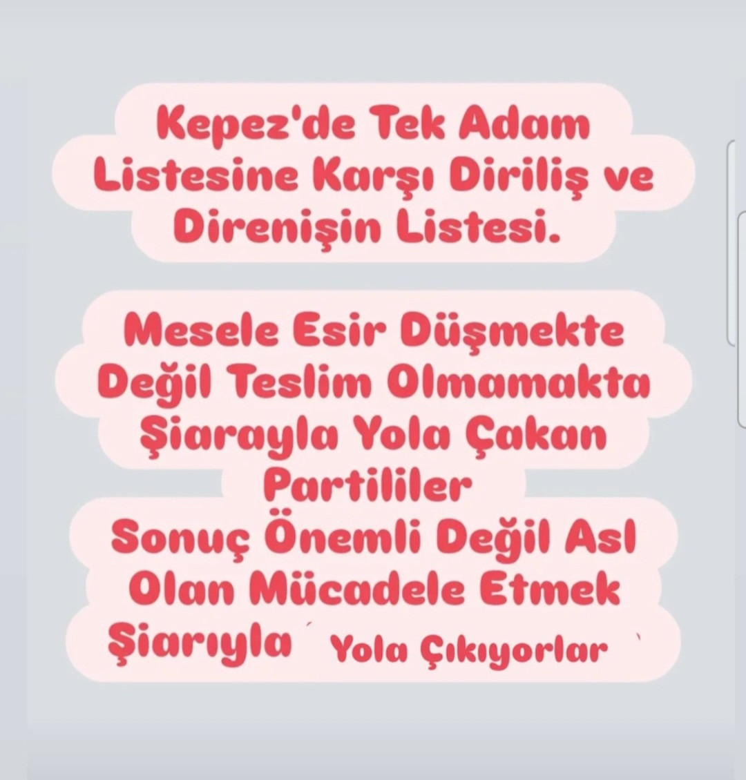 Kepez'de Birol Arslan'ın çıkardığı listeye karşı muhalif üyeler liste çıkartıp seçime gireceklerini açıkladılar. Asl olan mücadale etmek şiarıyla yola çıkan partililer seçimi kazanmak olduğunu ama demokratik tepkilerini göstermek babında liste çıkaracaklarını belirterek asl olan mücadele etmektir. Mesele esir düşmekte değil teslim olmamakta dediler.