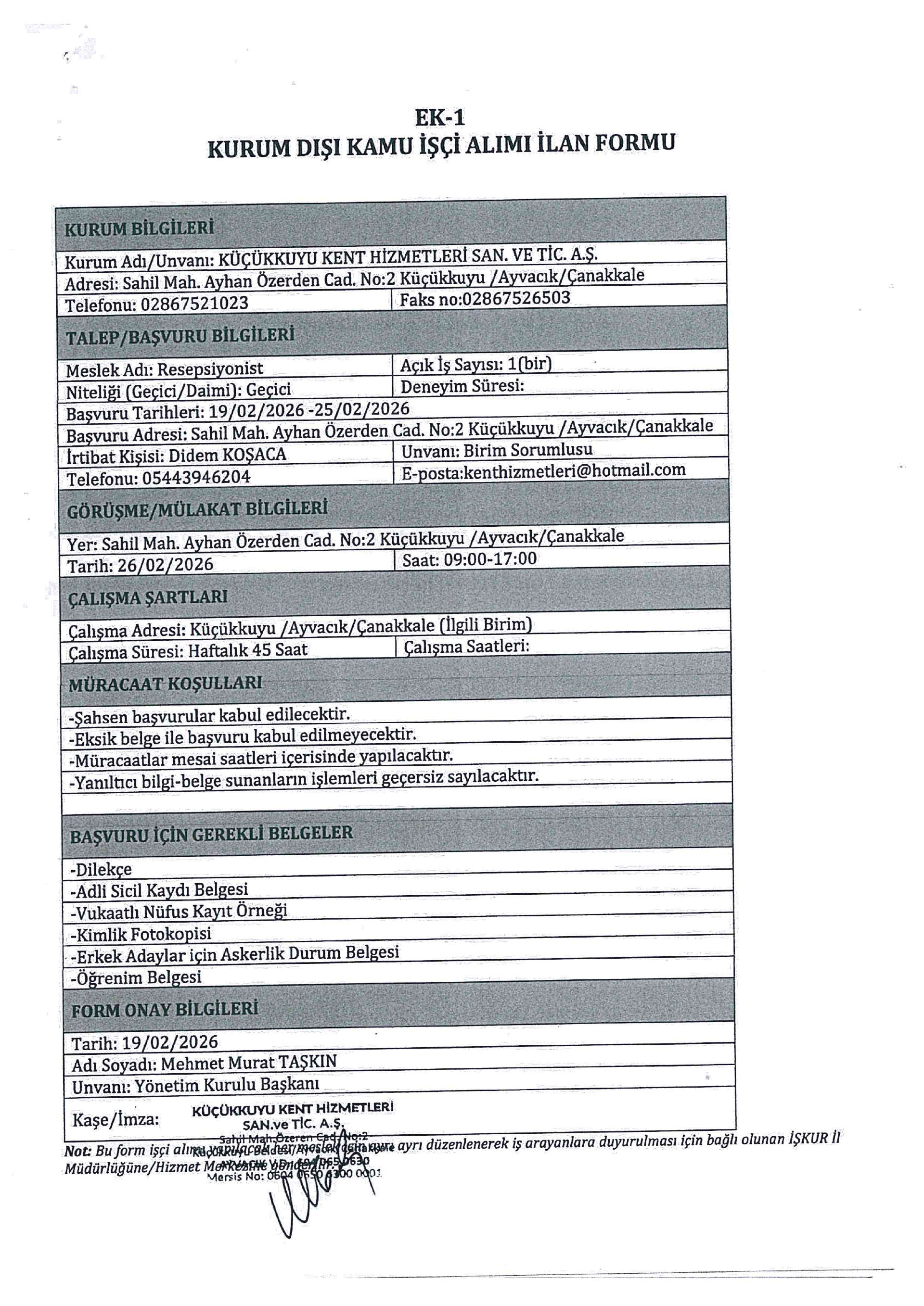 Küçükkuyu Kent Hizmetleri Geçici 1 İşçi Alacak. Son başvuru tarihi 25 Şubat 2026