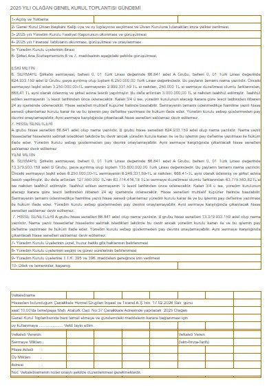 Aşağıda sunulan gündemi görüşmek üzere 2025 Yılı Olağan Genel Kurul Toplantısı 17.02.2026 Salı günü saat 10:00'da İsmetpaşa Mahallesi Atatürk Caddesi No:37 adresindeki Şirket merkezimizde yapılacaktır. Ortaklarımızın yukarıda ilân edilen tarih ve saatte belirlenen adreste Olağan Genel Kurul toplantısına katılmaları, toplantıya katılamayacakların kendilerinin vekil tayin edecekleri bir kişi ile temsil ettirmeleri ilân olunur. 26.01.2026