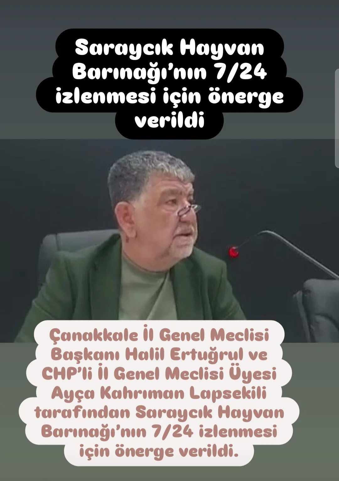 Çanakkale İl Genel Meclisi Başkanı Halil Ertuğrul ve CHP’li İl Genel Meclisi Üyesi Ayça Kahrıman Lapsekili tarafından Saraycık Hayvan Barınağı’nın 7/24 izlenmesi için önerge verildi. Önerge Plan Bütçe Komisyonu ve aynı zamanda Tarım ve Orman Komisyonuna sevk edildi.