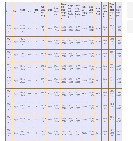 SGK, Biga'da 15 Adet Arsayı İhaleyle Satışa Sunuyor