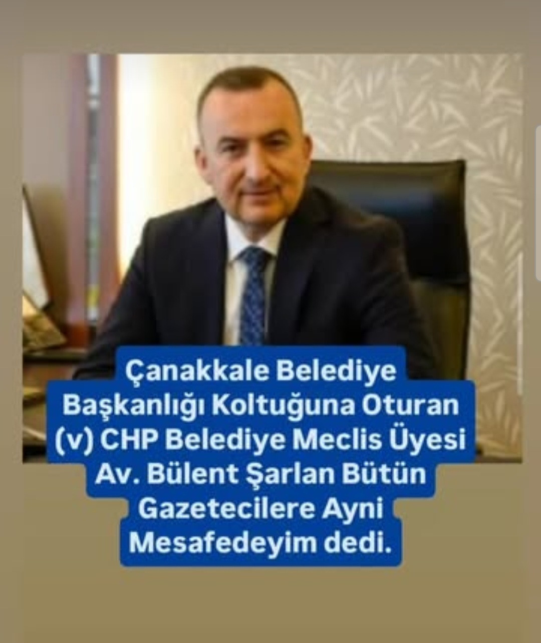 Çanakkale Barosu'nun uzun yıllar başkanlığını yapan Avukat Bülent Şarlan, baroyla özdeşleşmiş bir isim. Çanakkale siyasetine biraz geç giren Avukat Bülent Şarlan yurtdışında olan Muharrem Erkek'e vekaleten başkanlık koltuğunda oturuyor. Avukat Bülent Şarlan, bütün yurttaşlara olduğu gibi bütün gazetecilere ayni mesafede olduğunun altını çizdi.