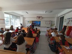 Çanakkale 112 Acil Çağrı Merkezi görevlileri, Arıburun İlkokulu öğrencilerine acil durumlarda tek numara olan 112'nin hangi durumlarda aranması gerektiği hakkında bilgilendirilme yaptı.