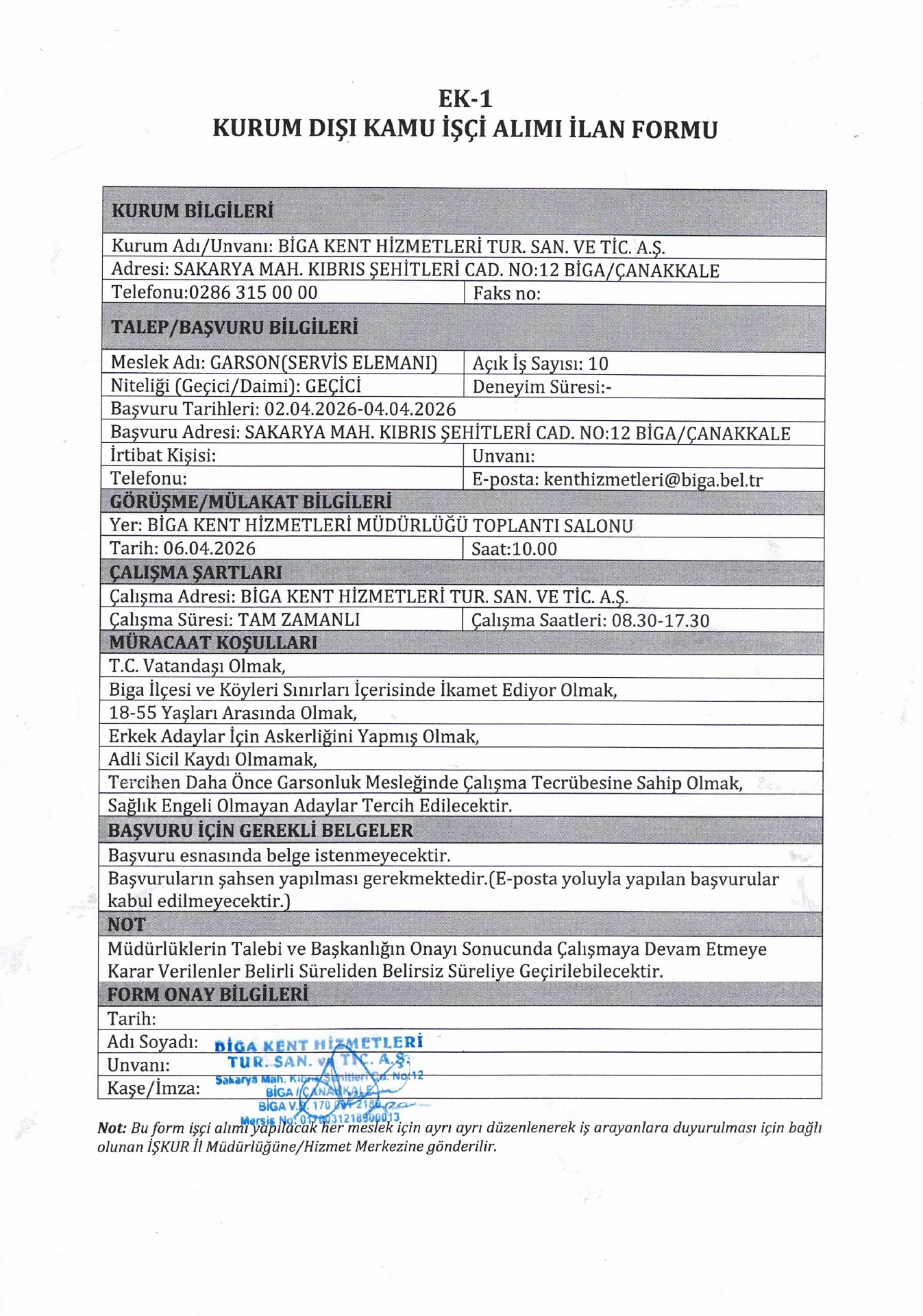 Biga Kent Hizmetleri Geçici 10 İşçi Alacak. Son başvuru tarihi 4 Nisan 2026