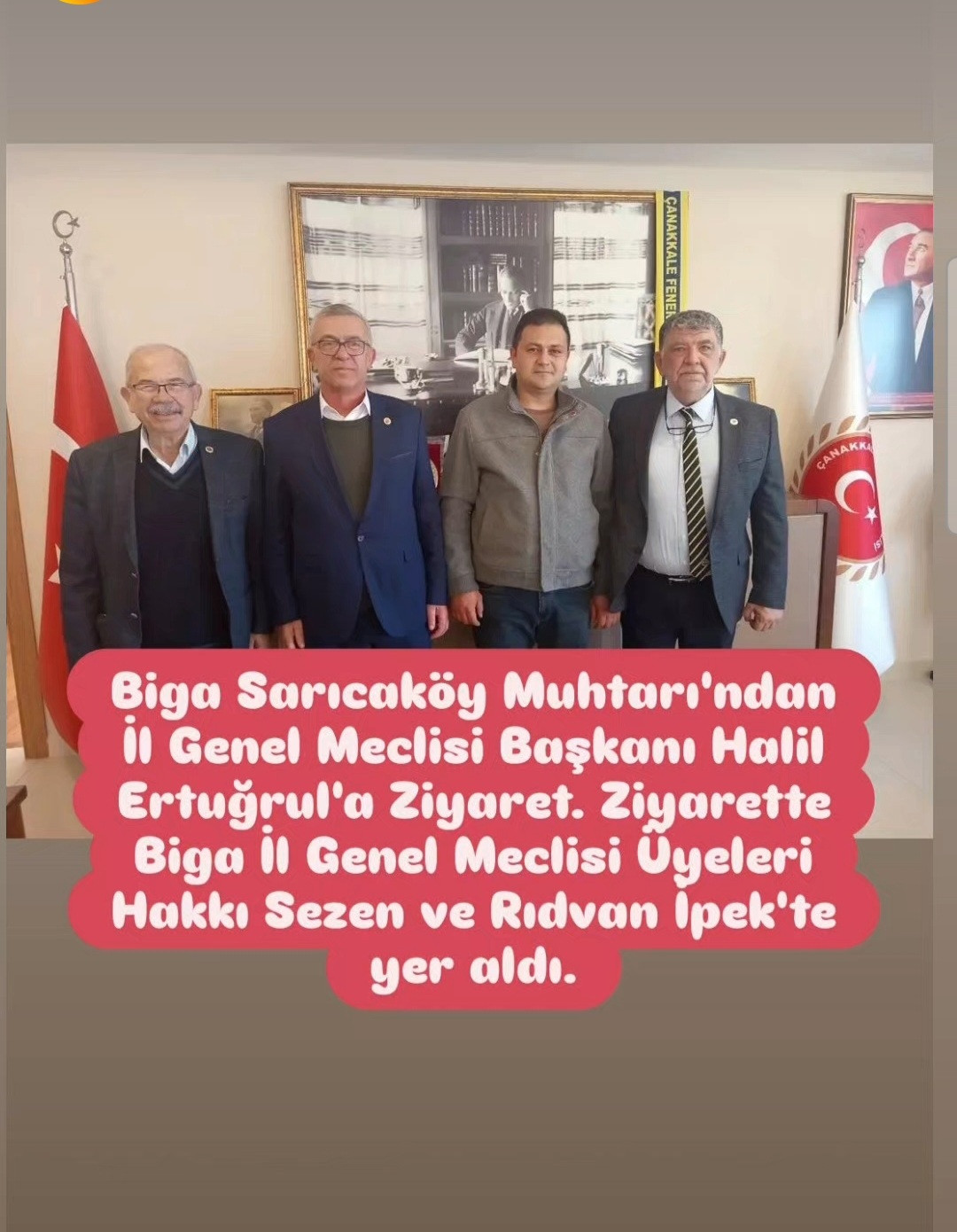 Biga Sarıcaköy Muhtarı Soner Bozkurt İl Genel Meclis Başkanı Halil Ertuğrul 'u makamında ziyaret etti. Ziyarette köyümüz ile ilgili konularda görüşmeler yapıldı. Ziyaret sonrası İl Genel Meclis Başkanı Halil Ertuğrul ziyaretleri için teşekkürlerini sundu. Ziyarete İl Genel Meclis Üyeleri Hakkı Sezen ve Rıdvan İpek eşlik etti.